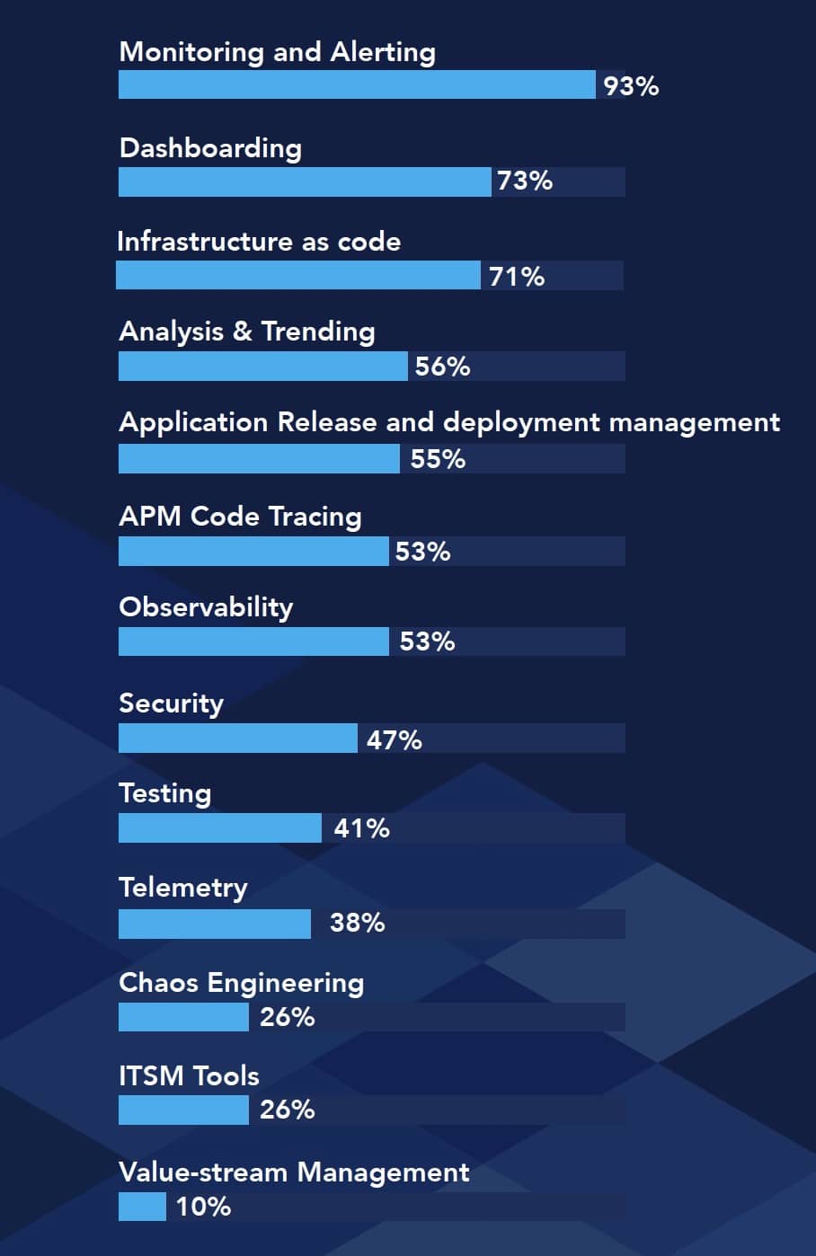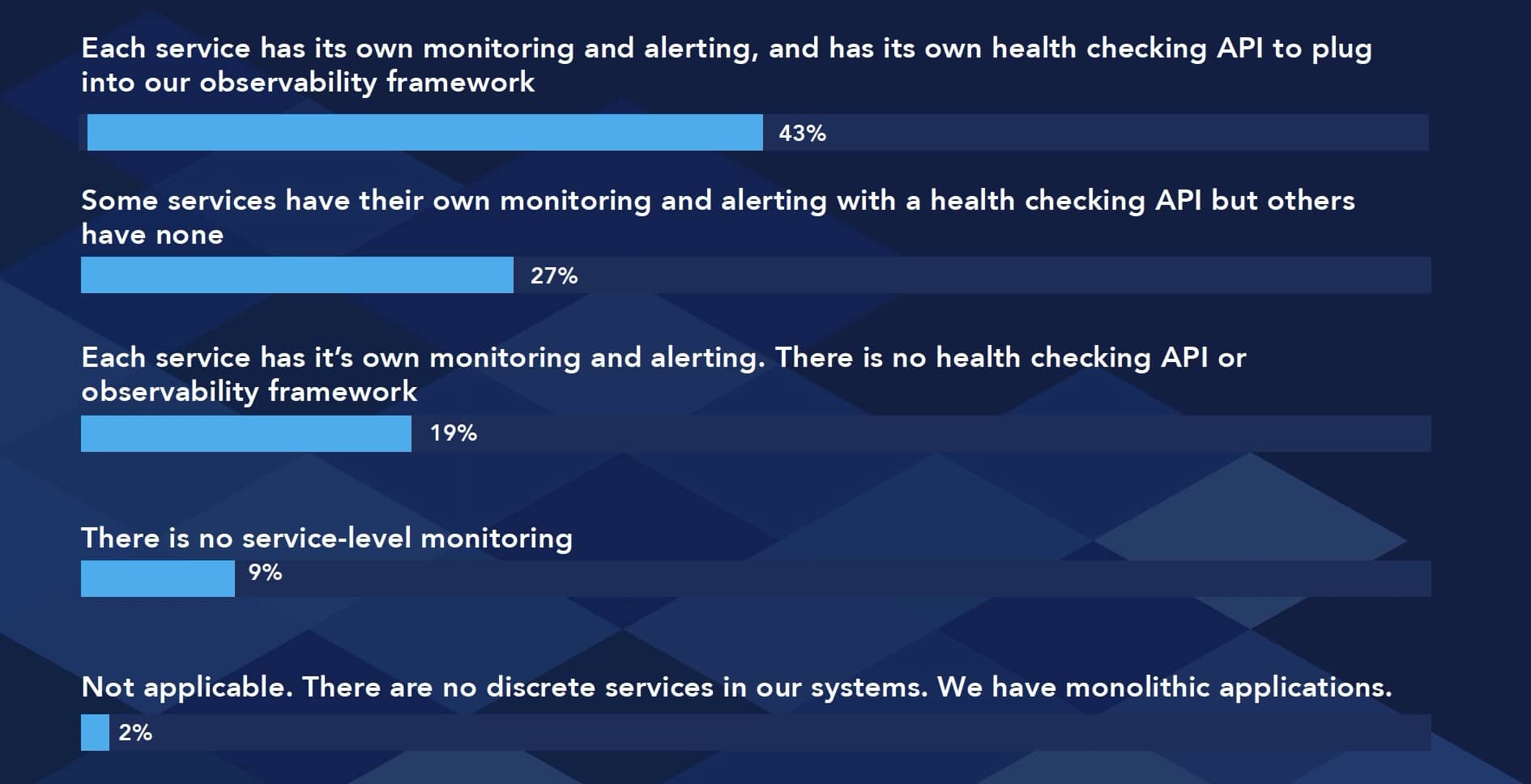 - 每个服务都有自己的监控和告警。没有健康检查API或可观测性框架。19%