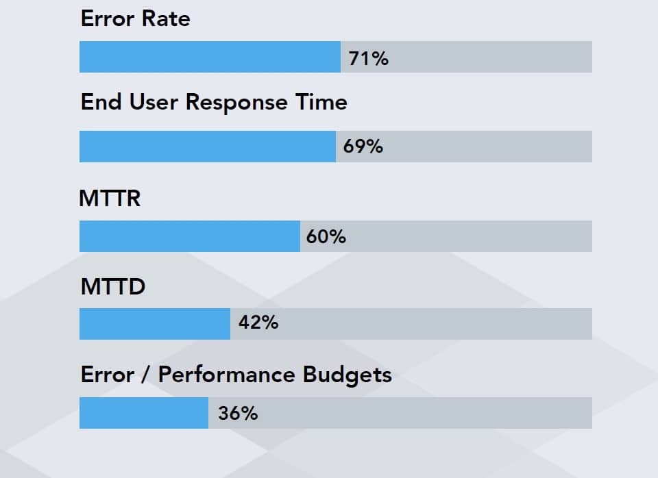 71%的受访者表示错误率是一种他们所跟踪的关键指标。表示客户满意度(数据见下一节)是一个高度优先级,但测量错误率而不是最终用户响应时间,将导致持续关注从内到外而不是从外到内。与其争论各种白盒与黑盒监控理论,不如专注于理解体验,进而研究用户体验交付的组件之间的关联性。