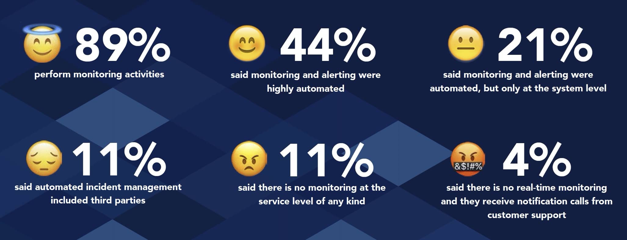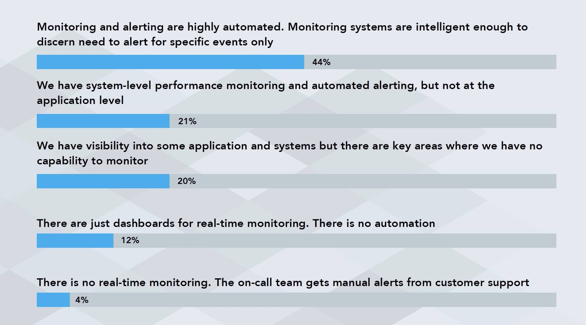 - 监控和告警的自动化程度高。监控系统足够智能,能够辨别是否需要对特定事件发出告警。44%