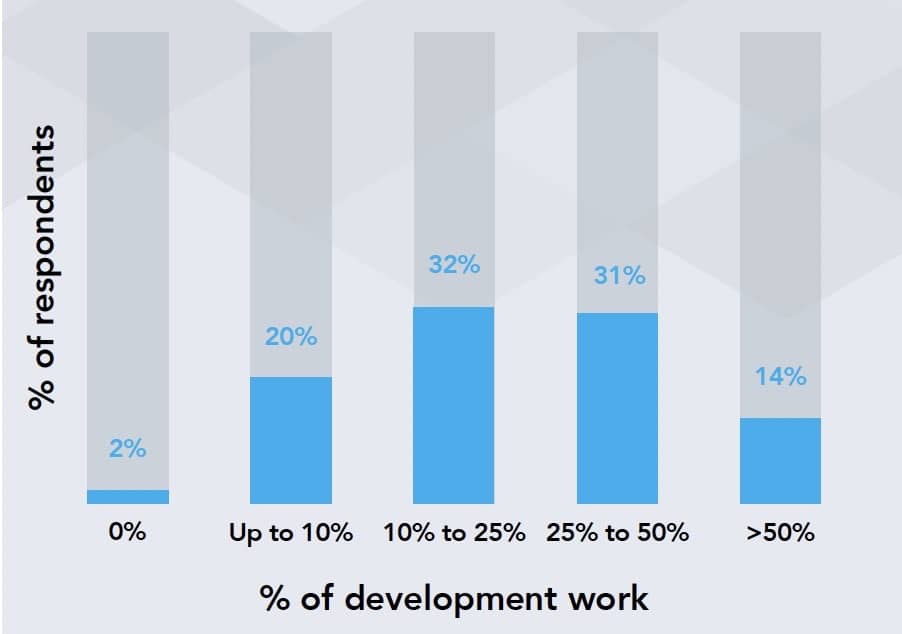 当受访者被问到:“SRE 的工作时间中开发工作的比例占多少?”这个问题时,只有 14% 的人表示超过 50%。