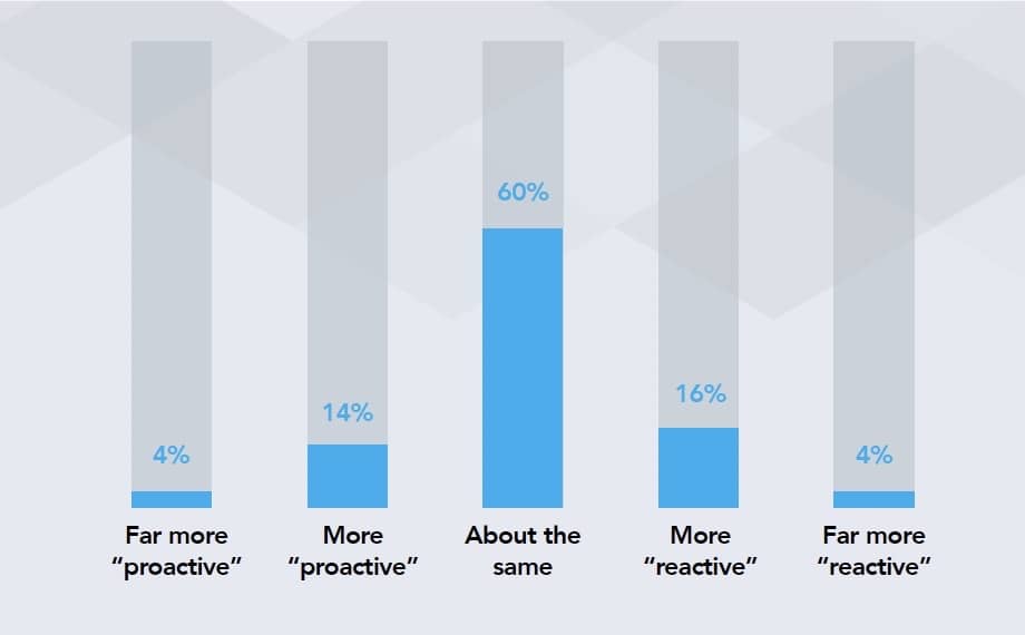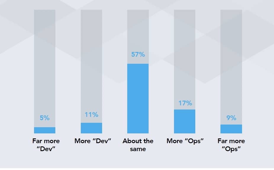 主动式与被动式相比(向更多的被动式净增2%)没有开发与运维相比(向更多的运维净增10%)的差距那么大。在这里,我们再次参考在家工作前的数据,表明75%的受访者在做运维活动(而25%在做开发活动)。