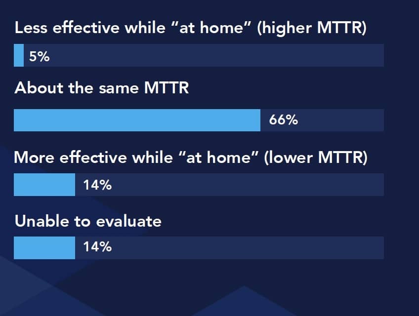 净+9%的受访者表示,自从在家之后,事件管理变得更加有效。这是一个令人振奋的数据,我们不知道更好的事件管理是否与公司做更少的发布有关(根据 Atlassian 的这个数据,66%的受访者已经放慢了他们软件的发布频率) 注意14%的受访者选择了无法评价和识别机会,看看是否是由于在家的原因。