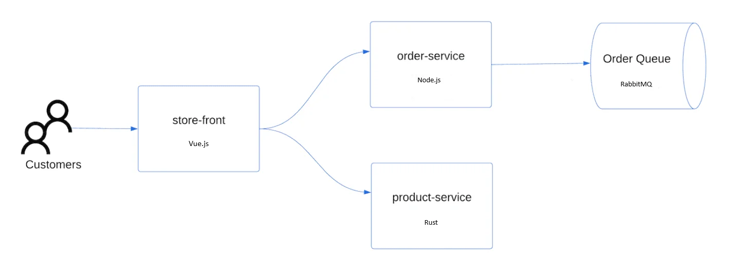 下面参考 https://learn.microsoft.com/zh-cn/azure/aks/learn/quick-kubernetes-deploy-cli 文档中的操作步骤,部署 AKS 应用商店应用程序 。该应用系统的示意图如下:
