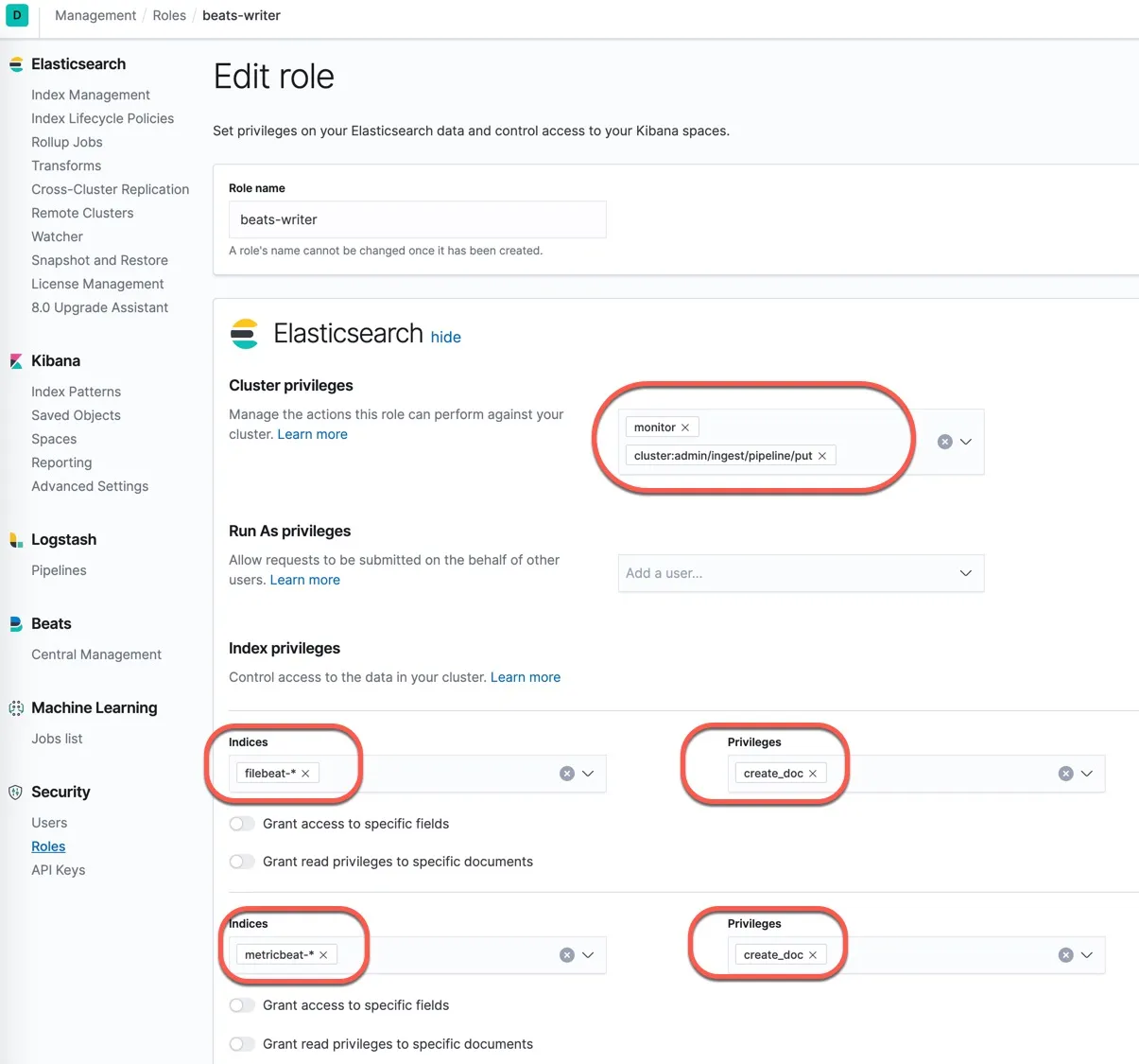 这个用户会用到后面的所有 Beats 配置文件中,用最小化权限用户极大的降低了数据泄露的风险。