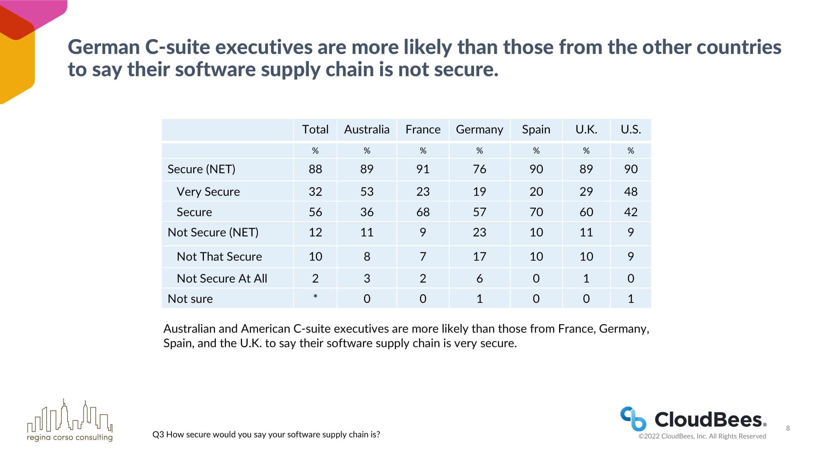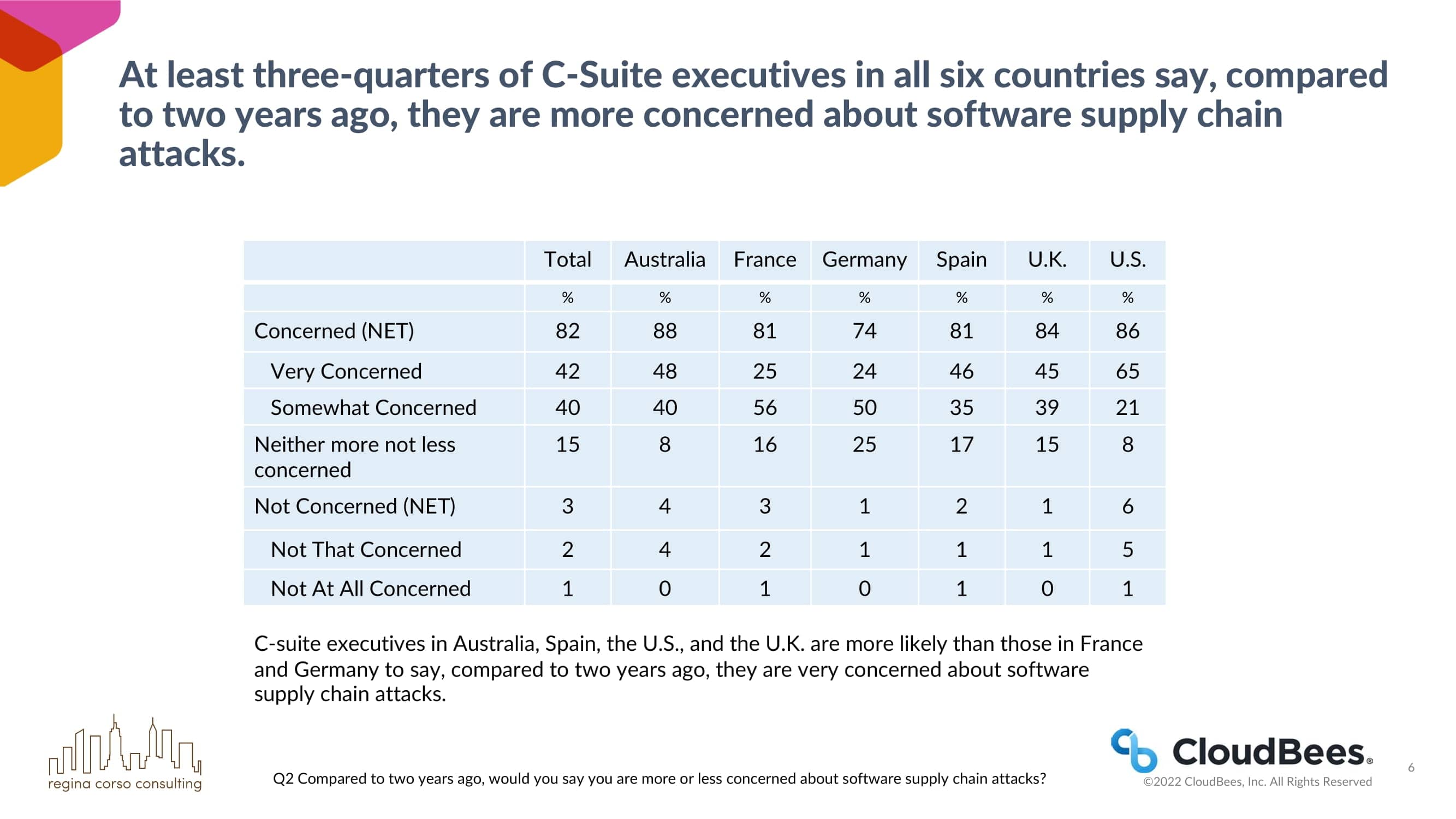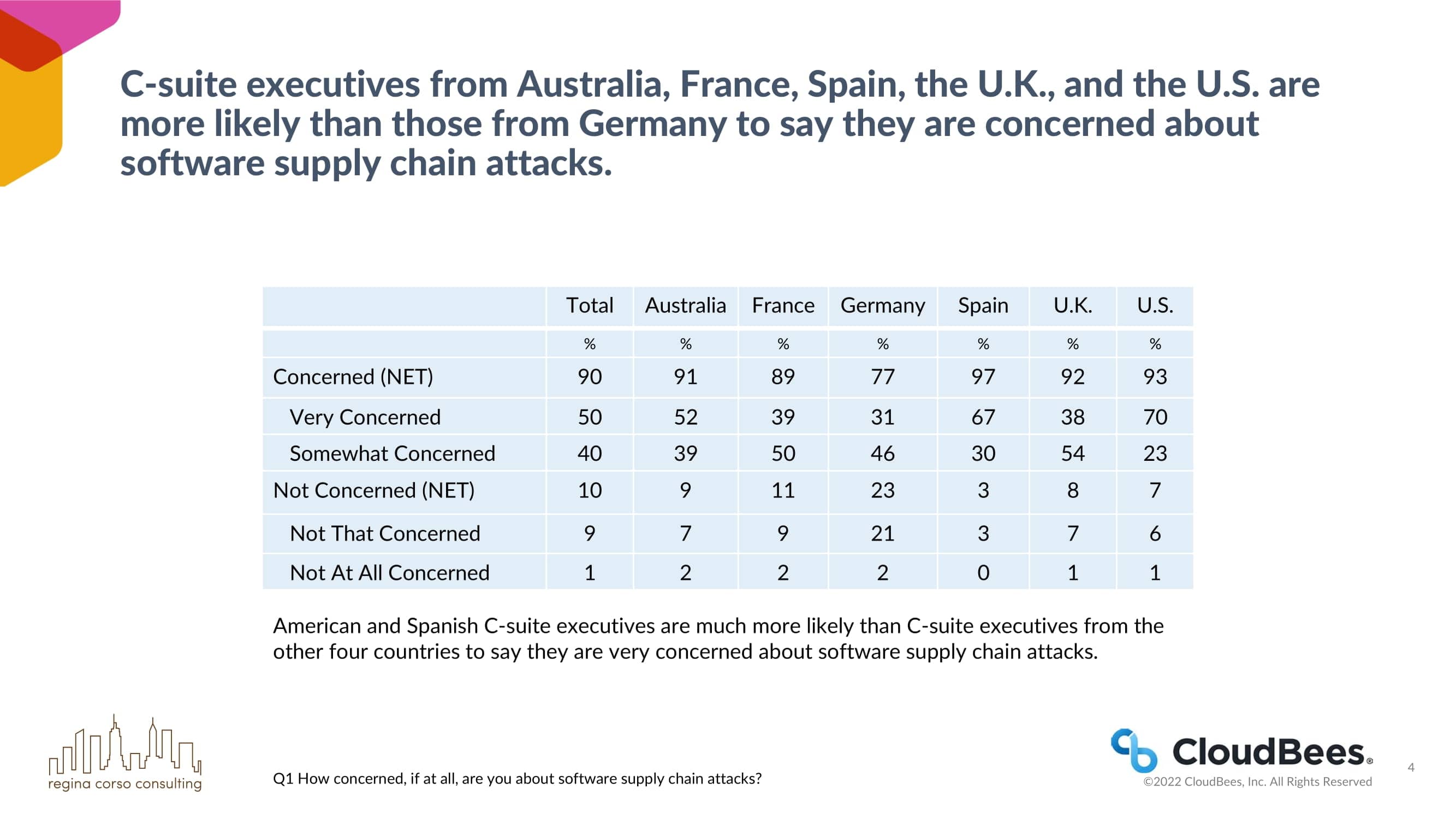 来自澳大利亚、法国、西班牙、英国和美国的C-suite高管比德国的C-suite高管更有可能说他们担心软件供应链的攻击。