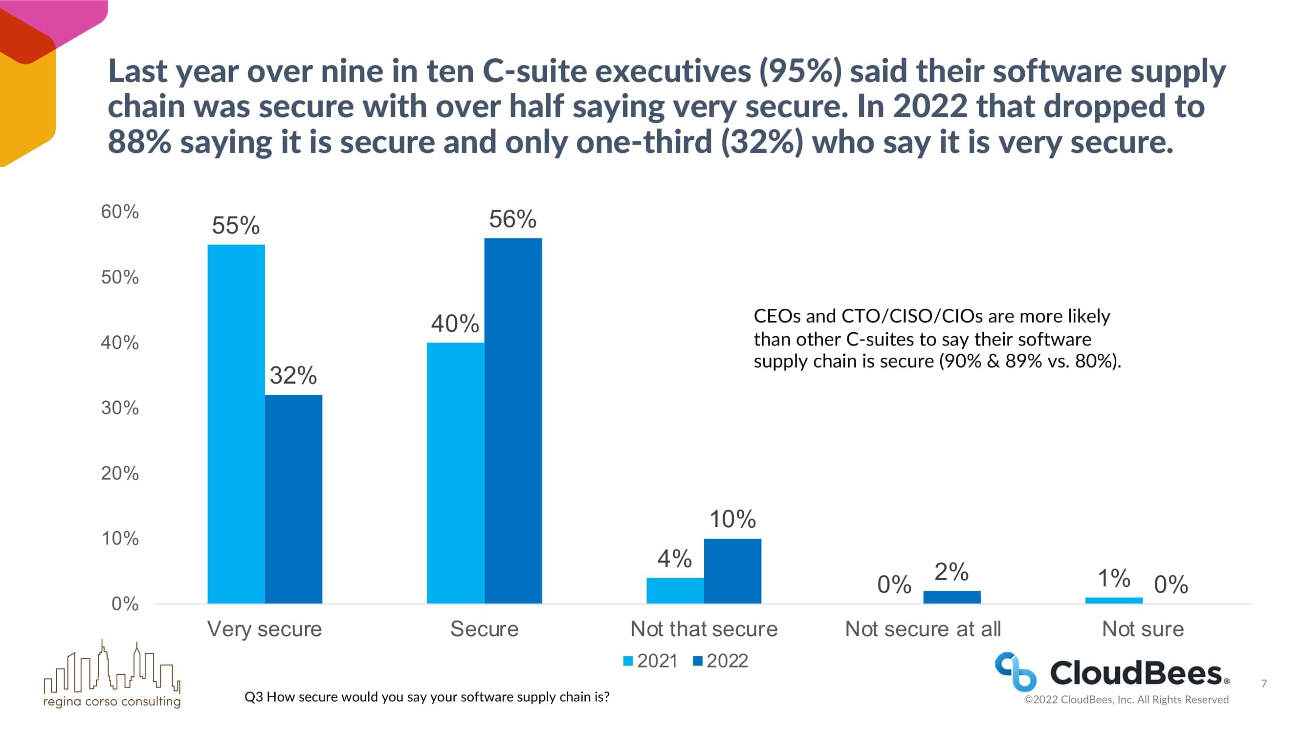 去年,超过九成(95%)的C-suite高管表示他们的软件供应链是安全的,超过一半表示非常安全。在2022年,这一比例下降到88%,认为它是安全的,只有三分之一(32%)的人认为它是非