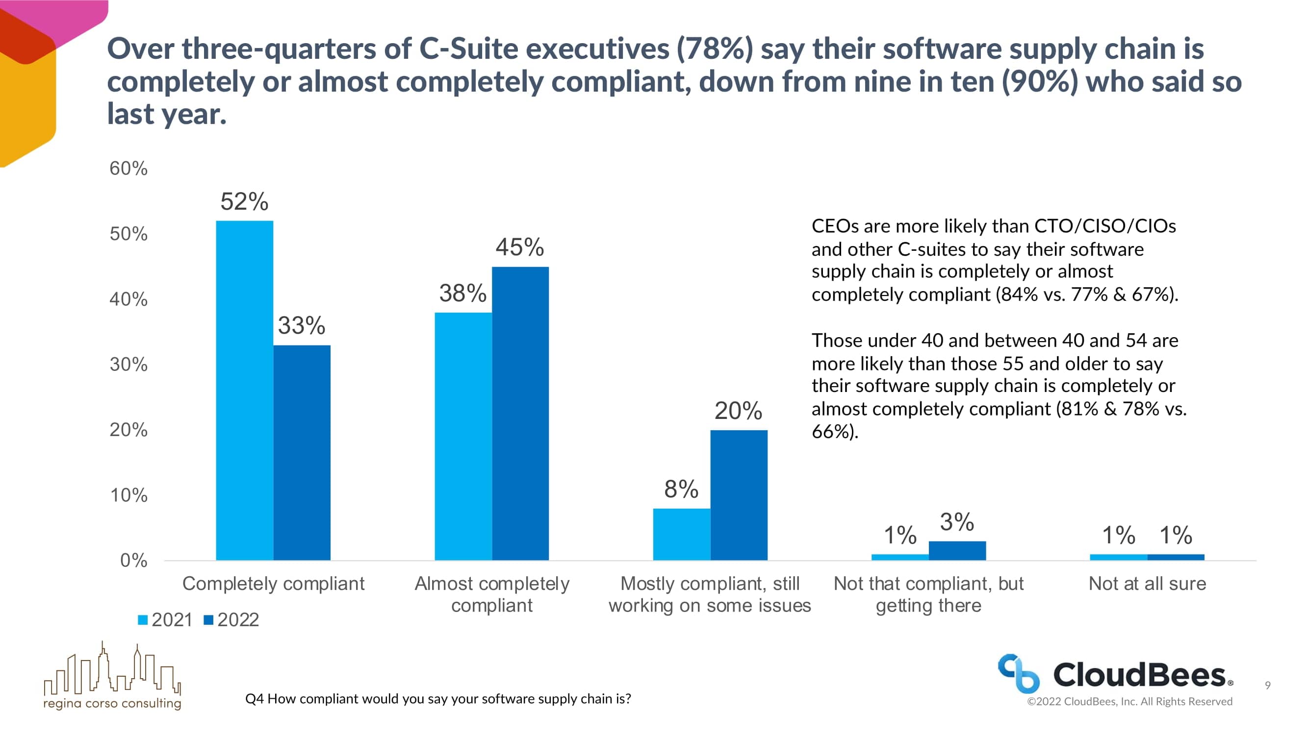超过四分之三的C-Suite高管(78%)表示他们的软件供应链完全或几乎完全合规,低于去年十分之九(90%)的说法。