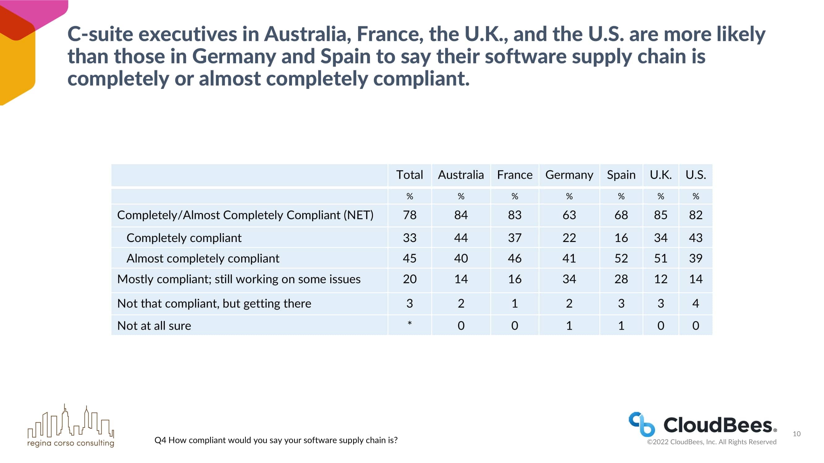 澳大利亚、法国、英国和美国的首席执行官比德国和西班牙的首席执行官更有可能说他们的软件供应链完全或几乎完全合规。