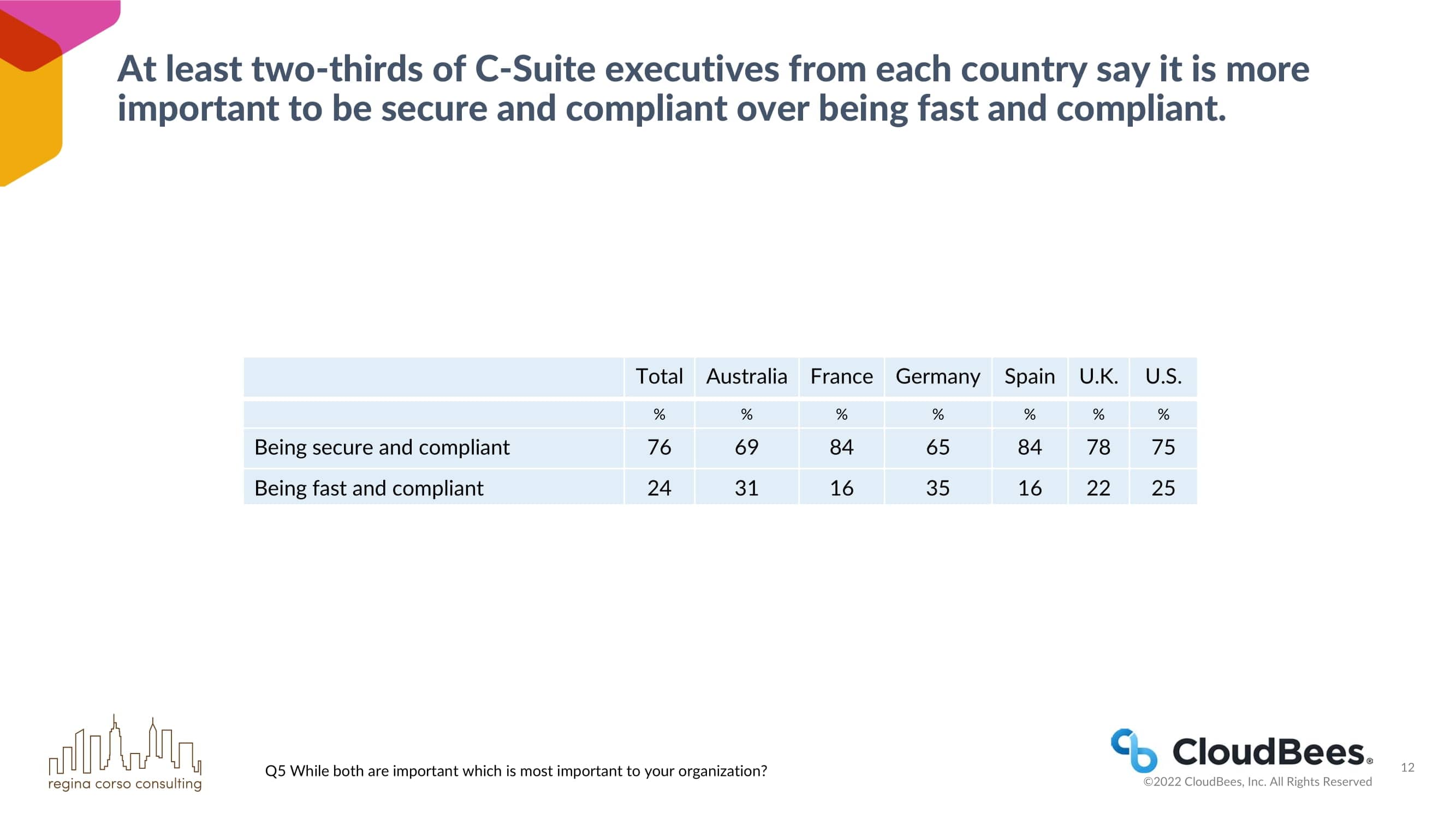 每个国家至少有三分之二的C-Suite高管表示安全和合规比快速和合规更重要。
