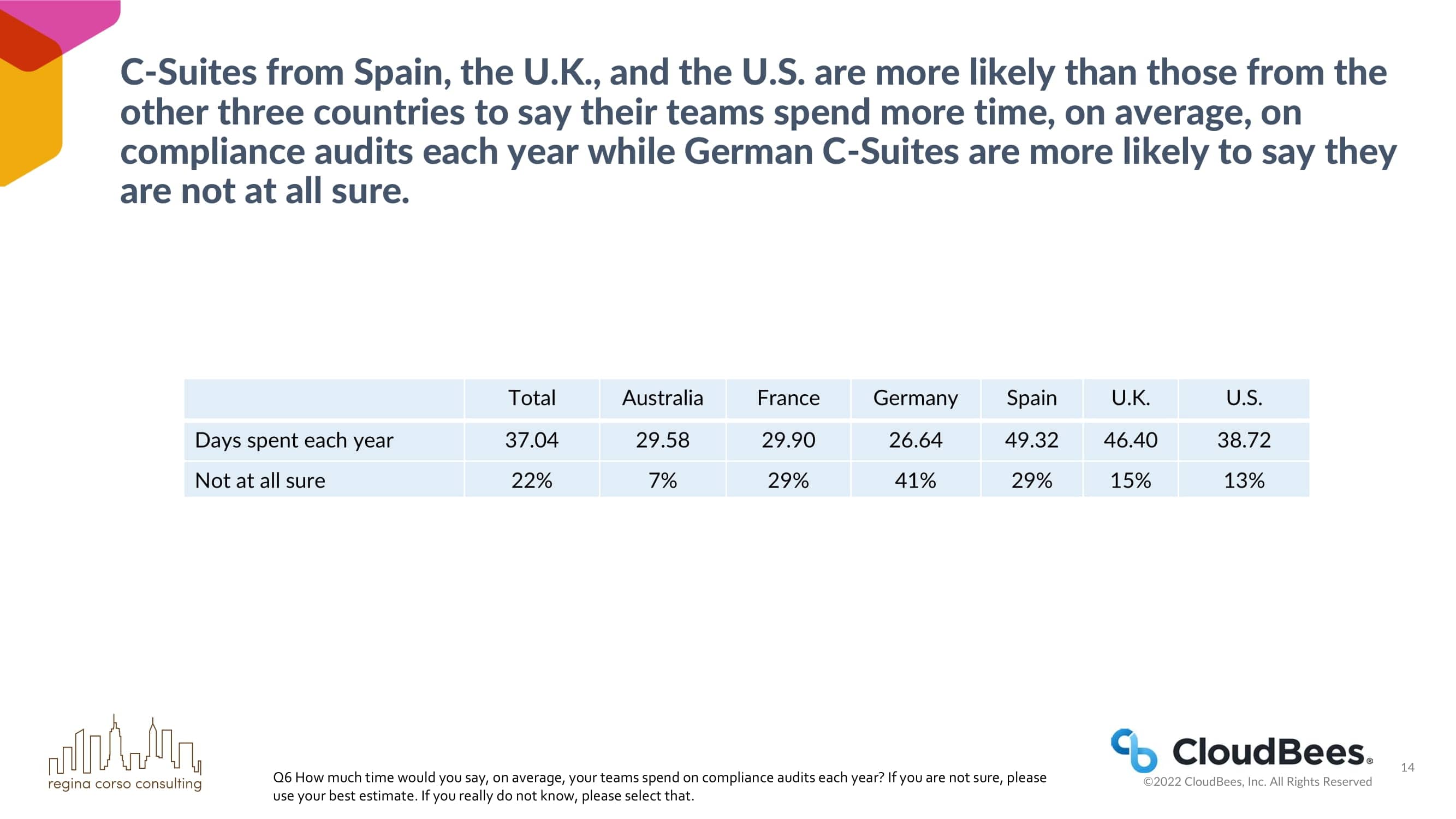 来自西班牙、英国和美国的C-Suite比其他三个国家的C-Suite更有可能说他们的团队每年平均花更多时间在合规性审计上,而德国的C-Suite更有可能说他们完全不确定。