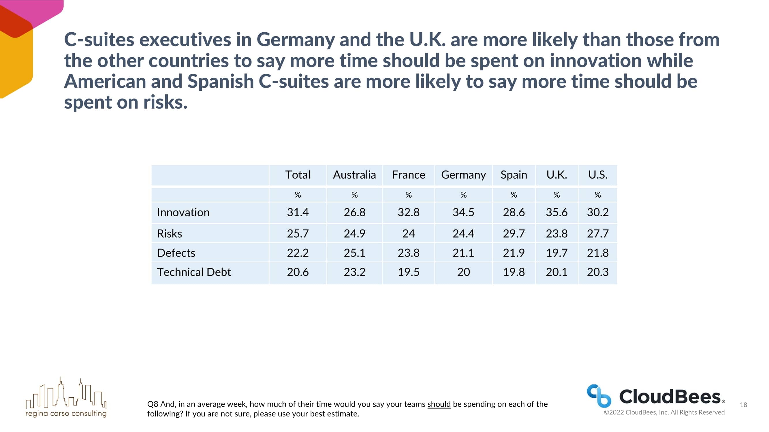 德国和英国的C-suites高管比其他国家的高管更有可能说更多的时间应该花在创新上,而美国和西班牙的C-suites更有可能说更多的时间应该花在风险上。