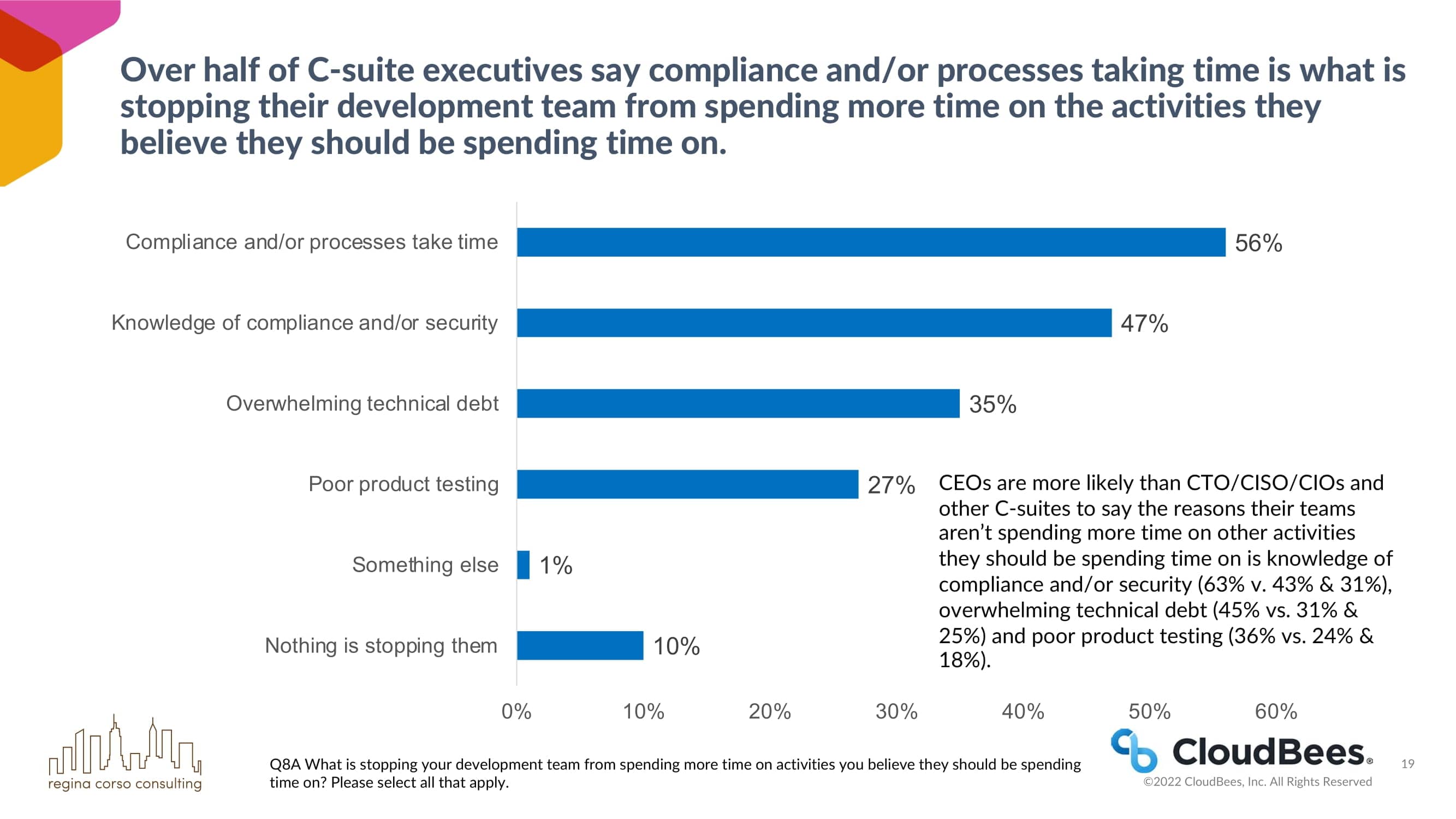 超过一半的C-suite高管表示,合规性和/或流程占用时间是阻止他们的开发团队花更多时间在他们认为应该花时间的活动上的原因。