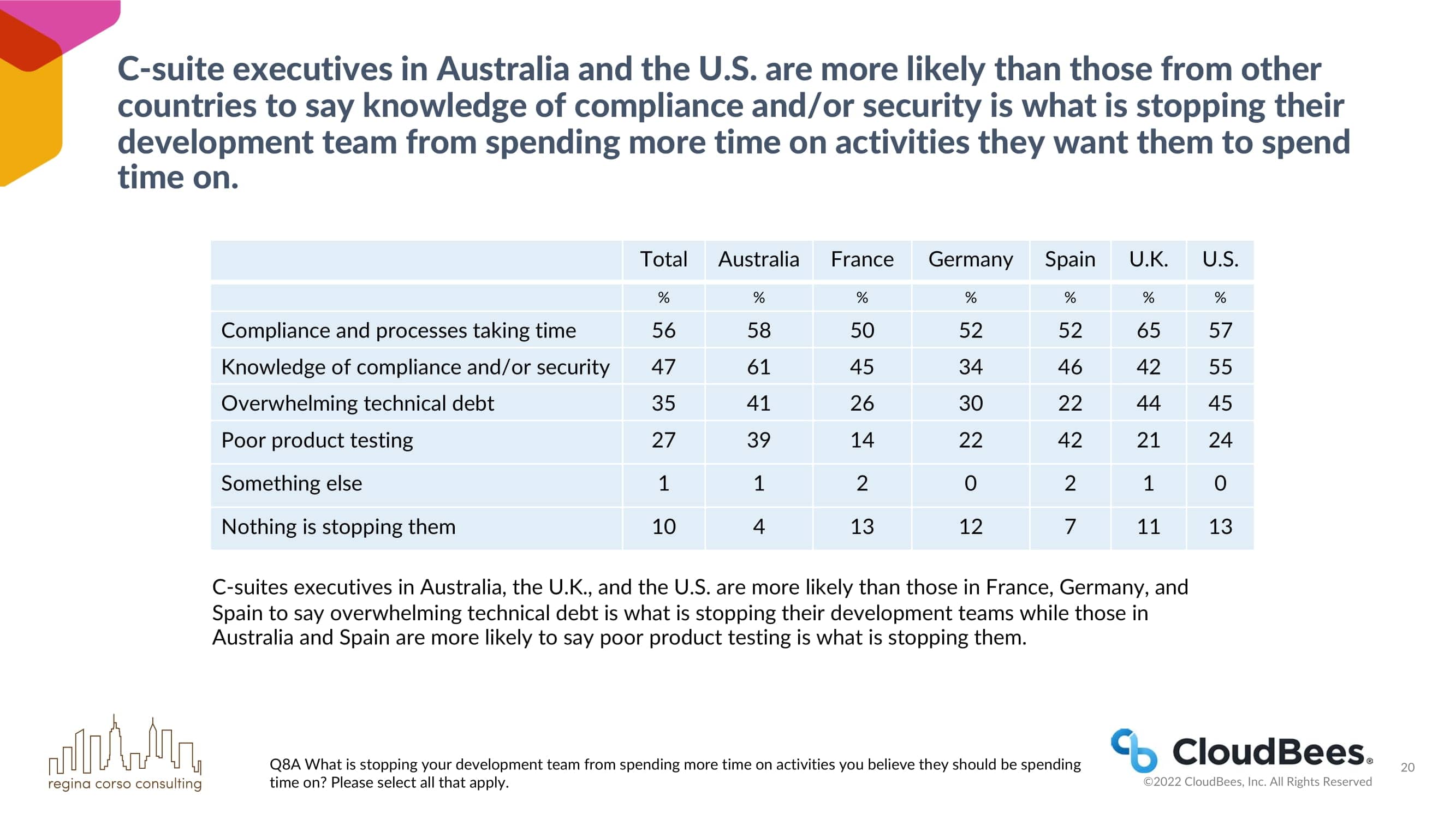 澳大利亚和美国的C-suite高管比其他国家的C-suite高管更有可能说合规和/或安全知识是阻止他们的开发团队花更多时间在他们希望他们花时间的活动上。