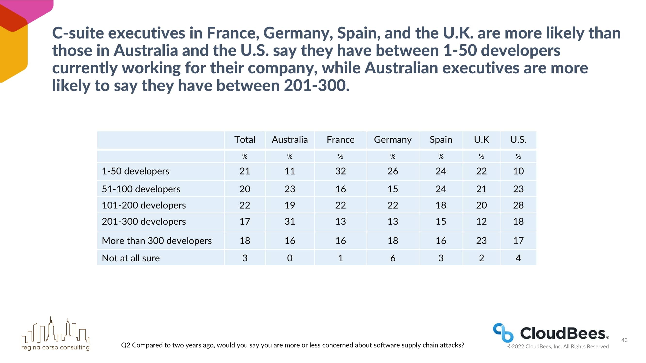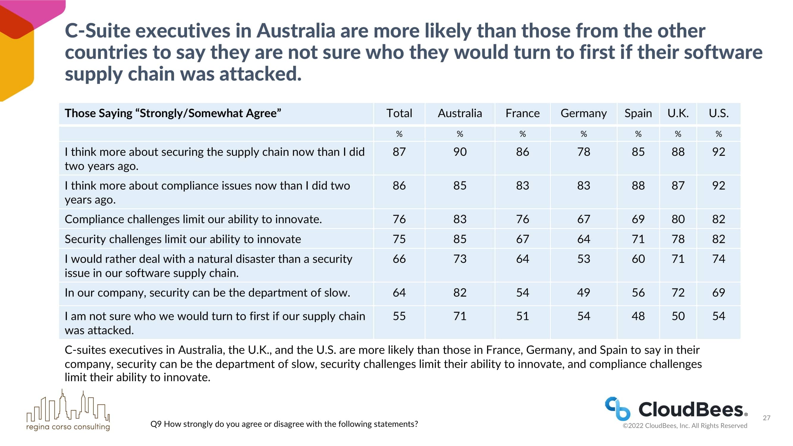 - CloudBees与Regina Corso Consulting合作,对澳大利亚、法国、德国、西班牙、英国和美国的C-suite高管进行了调查,以收集关于软件供应链和围绕它的安全问题的见解。