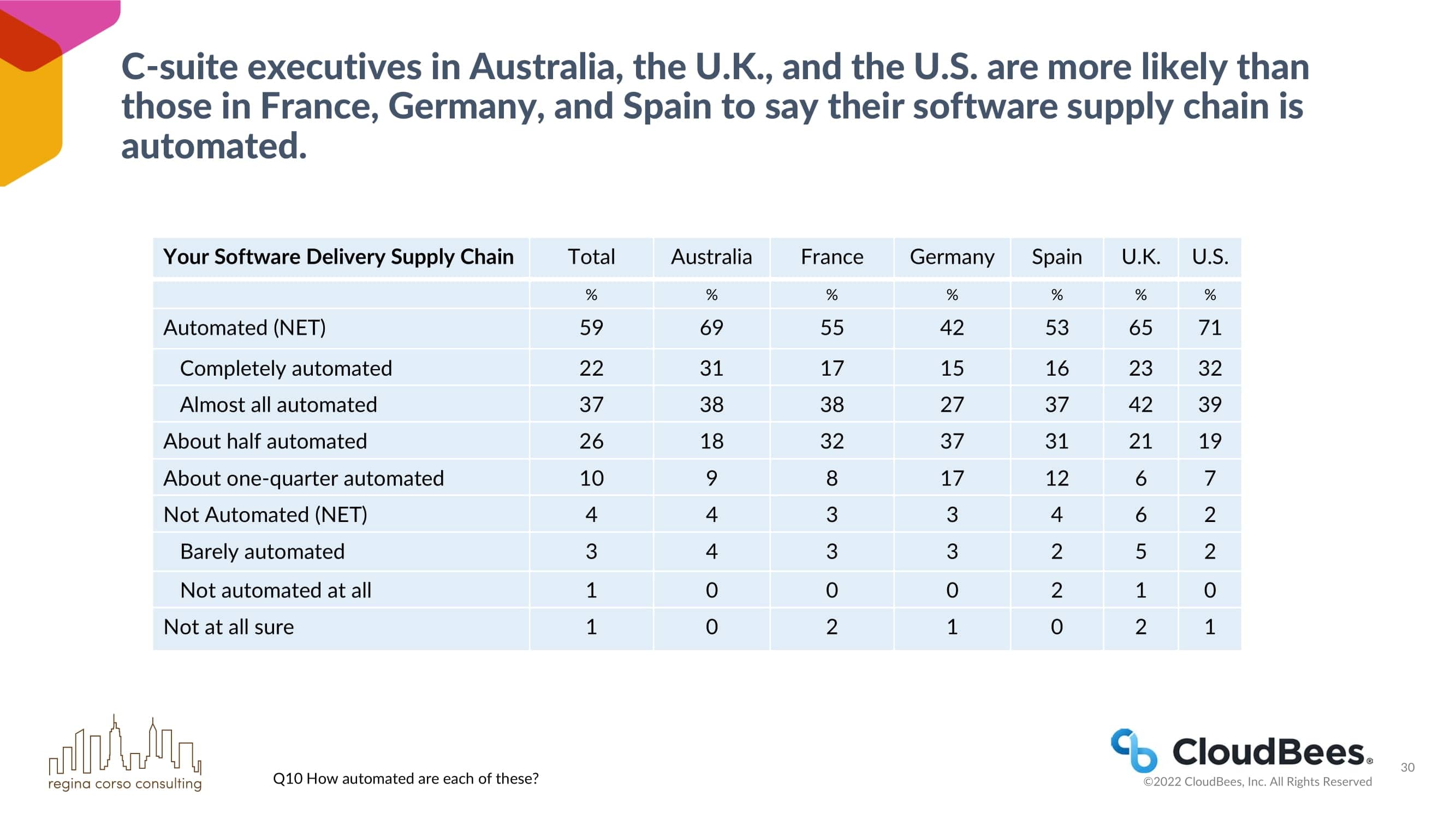 澳大利亚、英国和美国的首席执行官比法国、德国和西班牙的首席执行官更可能说他们的软件供应链是自动化的。
