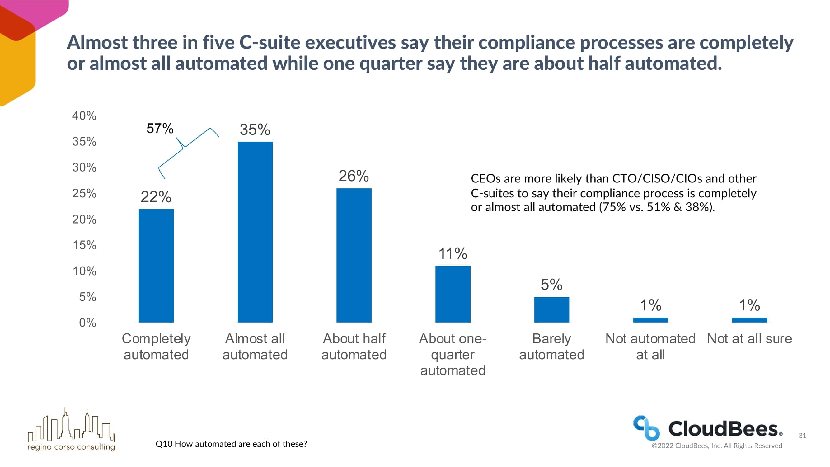 近五分之三的企业高管表示他们的合规流程完全或几乎全部自动化,而四分之一的企业高管表示他们的合规流程大约有一半自动化。