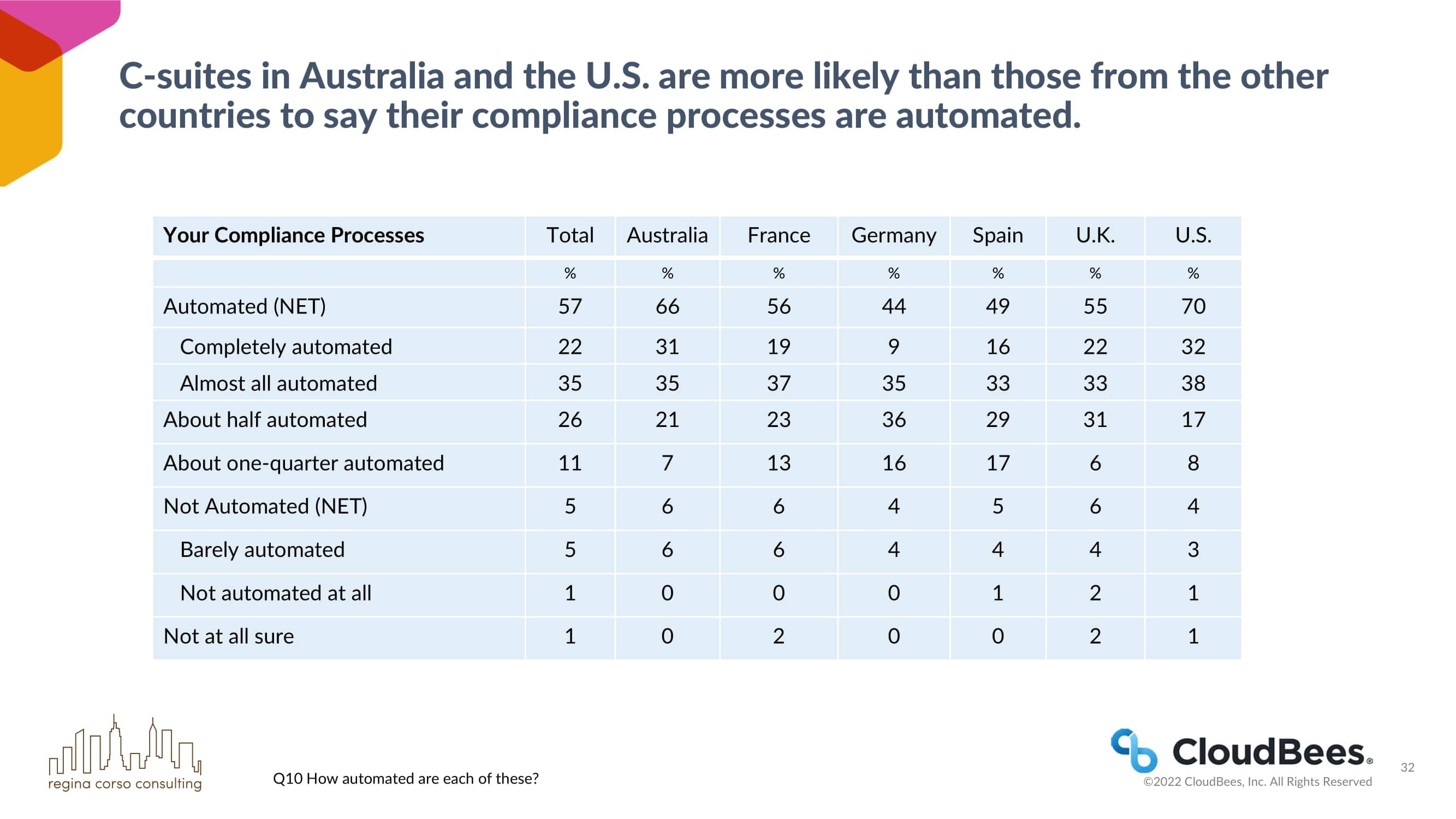 澳大利亚和美国的C-suites比其他国家的C-suites更可能说他们的合规流程是自动化的。