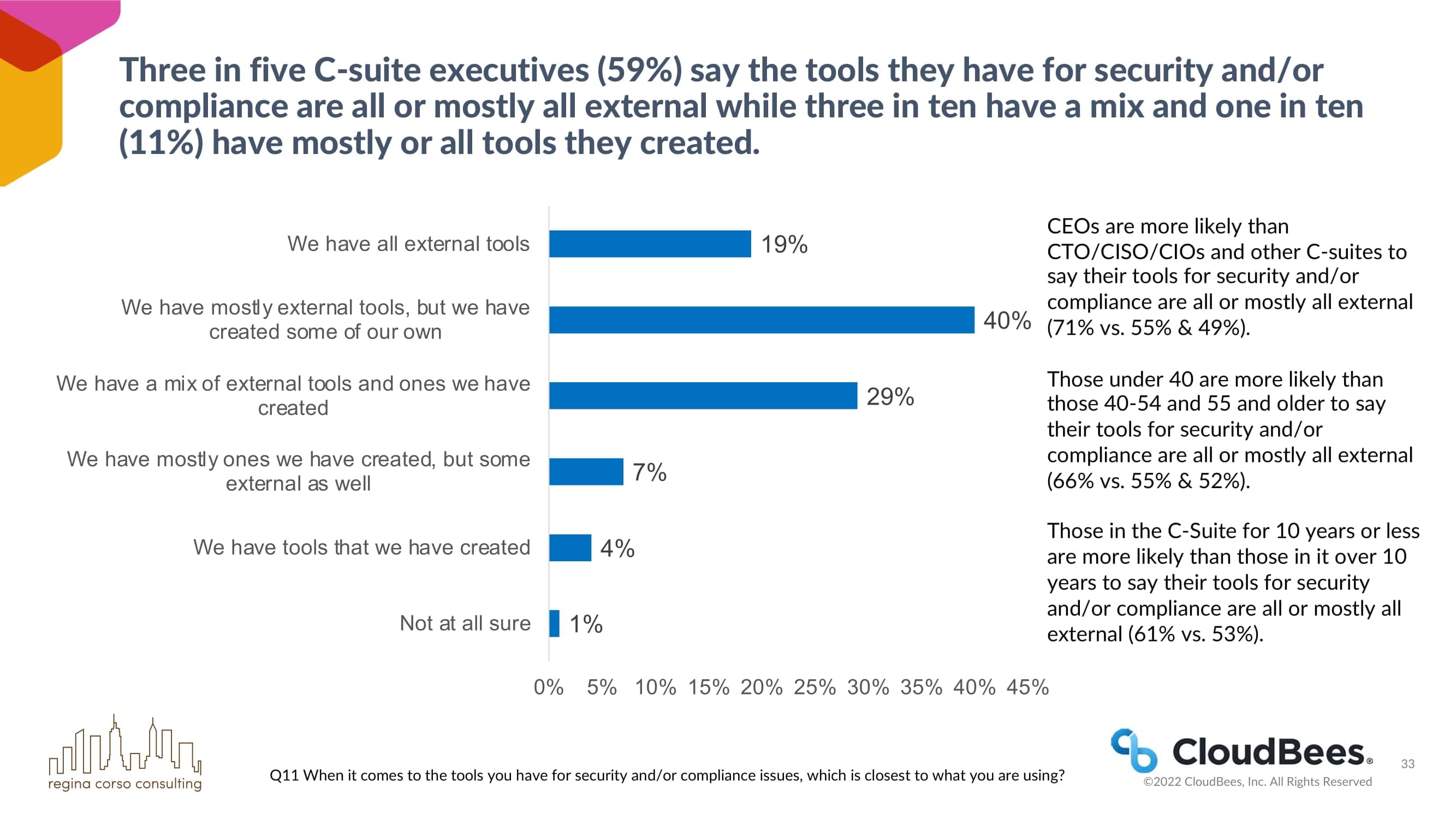 五分之三的C-suite高管(59%)表示,他们拥有的安全和/或合规性工具全部或大部分都来自外部,而十分之三的人拥有混合的工具,十分之一的人(11%)拥有大部分或全部自己创建的工具。