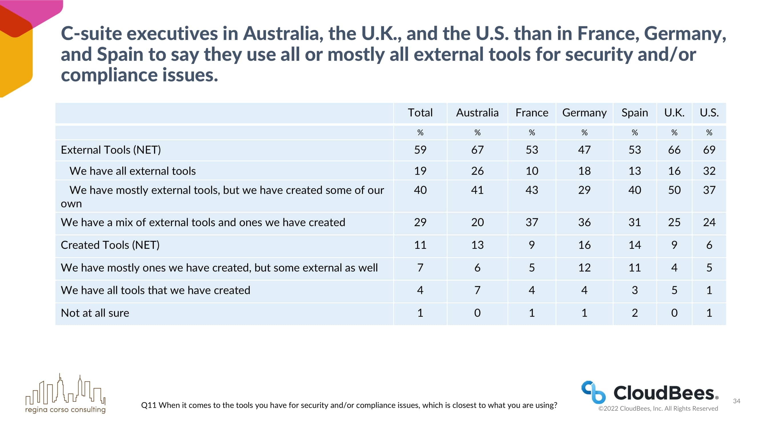 与法国、德国和西班牙相比,澳大利亚、英国和美国的首席执行官们表示,他们在安全和/或合规问题上使用了所有或大部分的外部工具。
