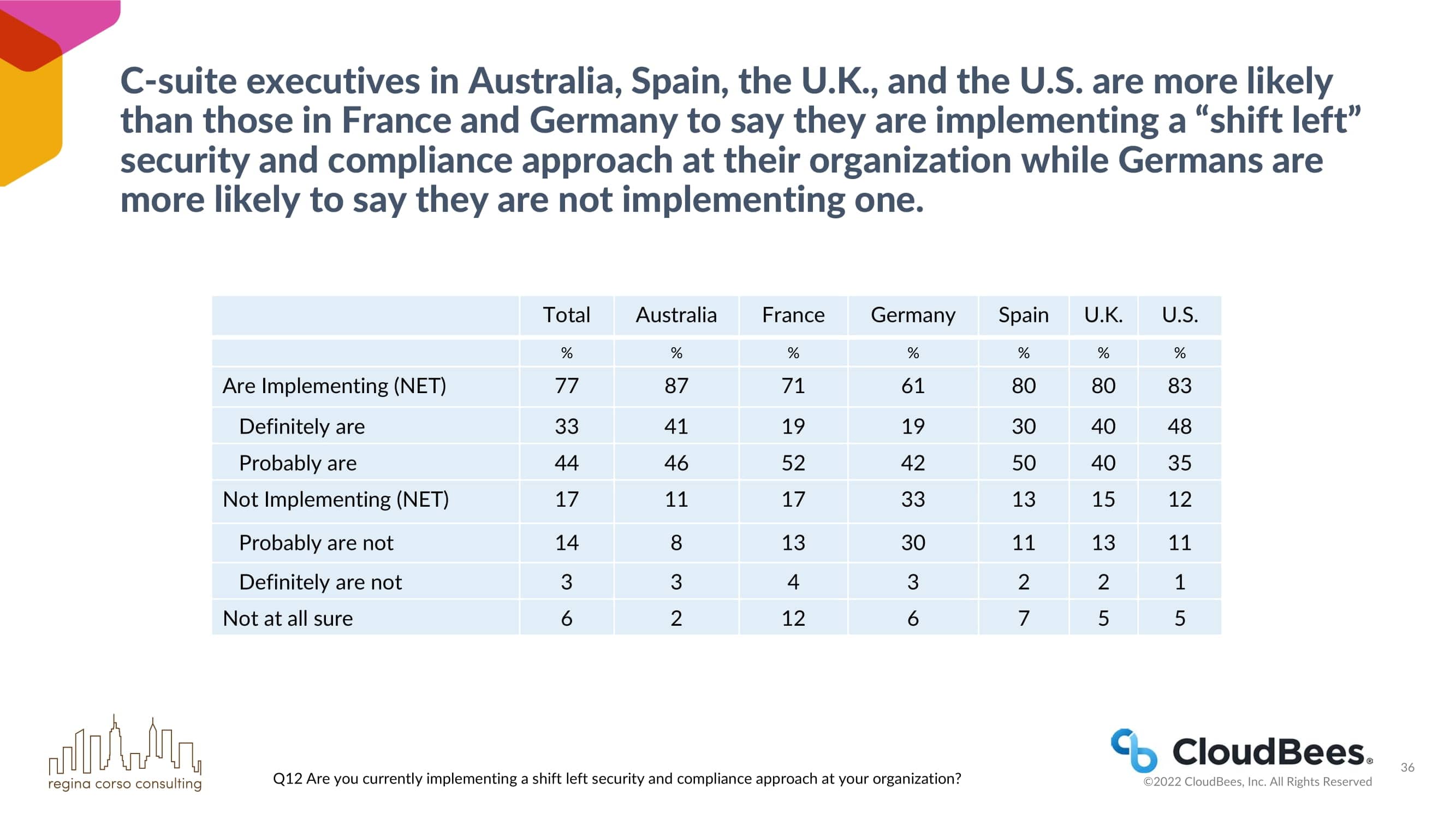 澳大利亚、西班牙、英国和美国的首席执行官比法国和德国的首席执行官更有可能说他们正在其组织中实施 “左移 “的安全和合规方法,而德国人更有可能说他们没有实施这种方法。