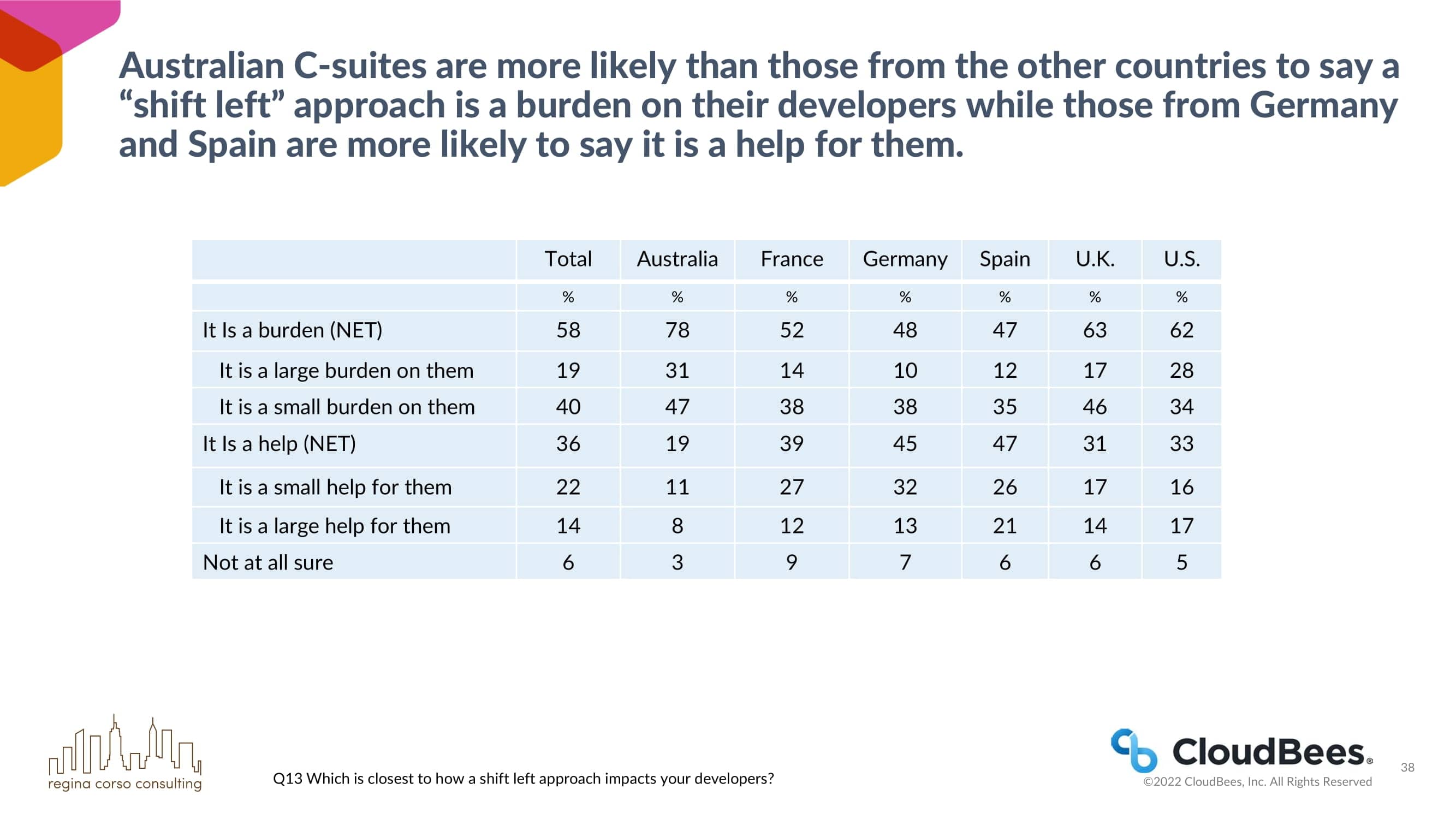 澳大利亚的C-suites比其他国家的C-suites更有可能说 “左移 “方法对他们的开发人员是一种负担,而德国和西班牙的C-suites更有可能说这是对他们的帮助。
