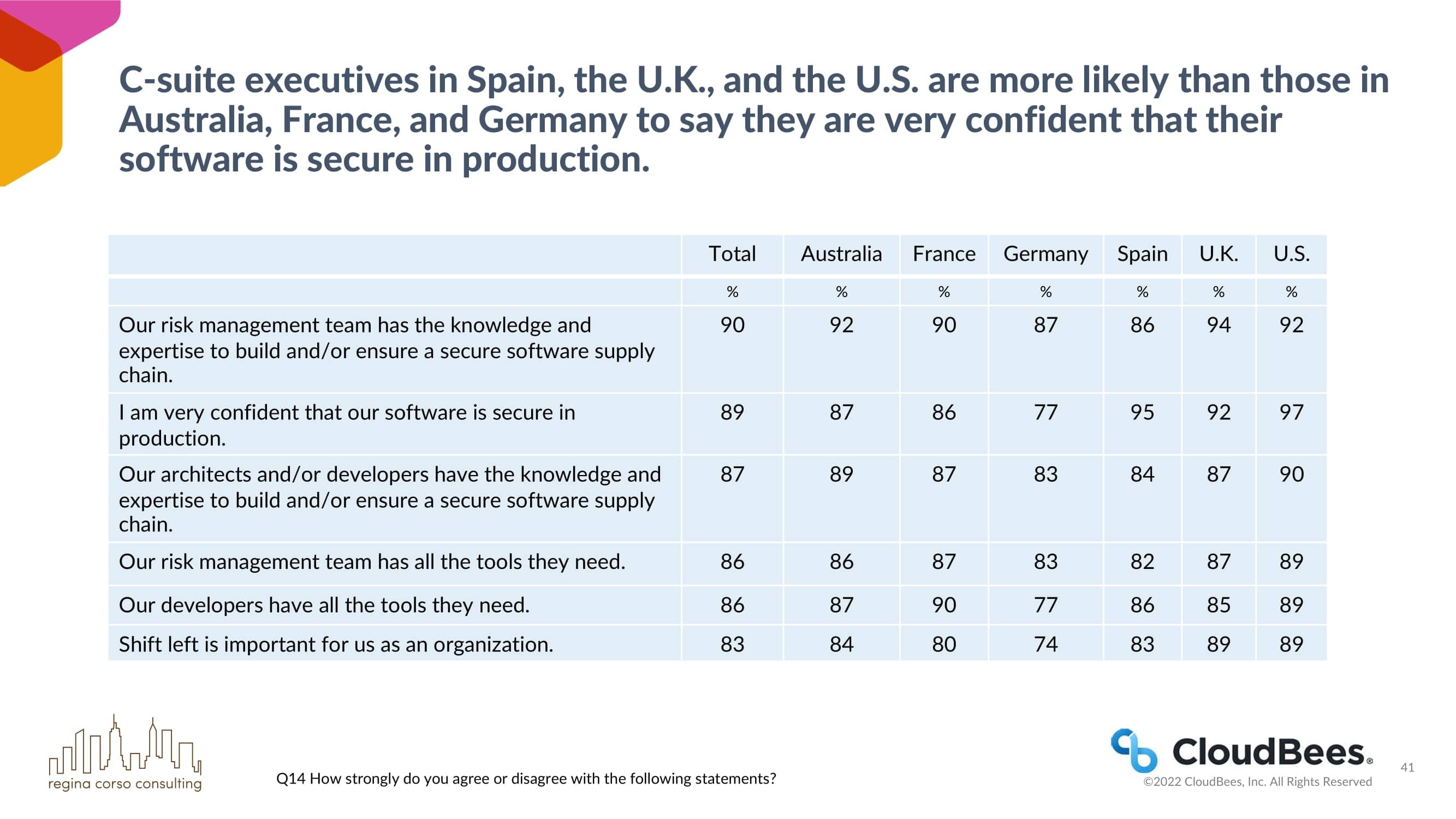 西班牙、英国和美国的C-suite高管比澳大利亚、法国和德国的C-suite高管更有可能说他们对自己的软件在生产中的安全性非常有信心。