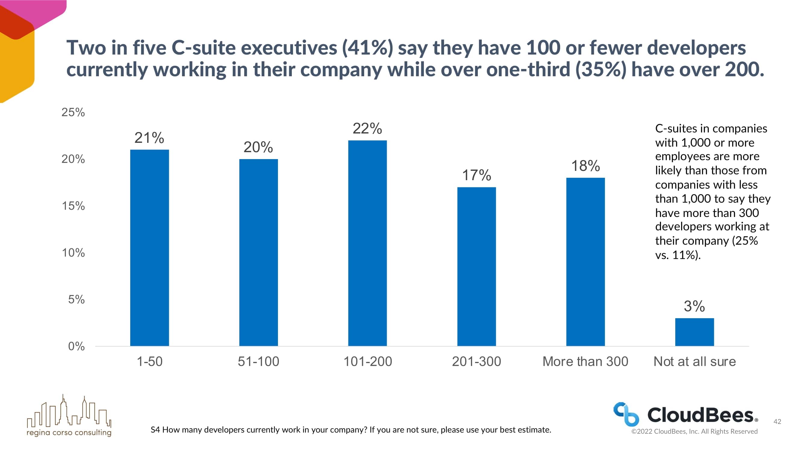 五分之二的C-suite高管(41%)说他们公司目前有100个或更少的开发人员,而超过三分之一(35%)的人超过200个。