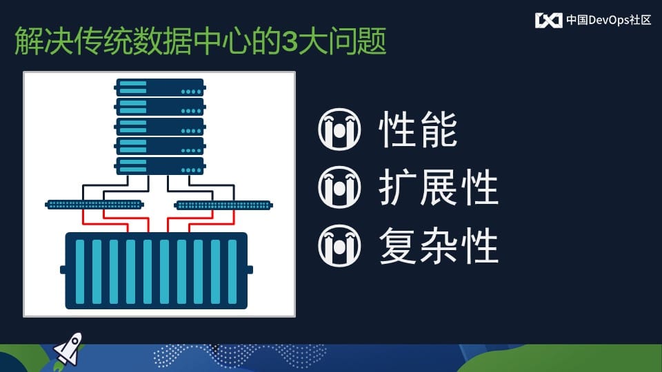 三层架构即由x86服务器层、网络层(以太网/SAN)和存储层所搭建的规模不大数量巨多的虚拟化/物理机集群资源池。由于虚拟化技术的成熟和普及,这些虚拟化集群资源池为业务应用提供了所需要的计算、存储和网络资源。在最近十几年的企业数据中心中处于主力架构,但是它有其核心的三大问题: