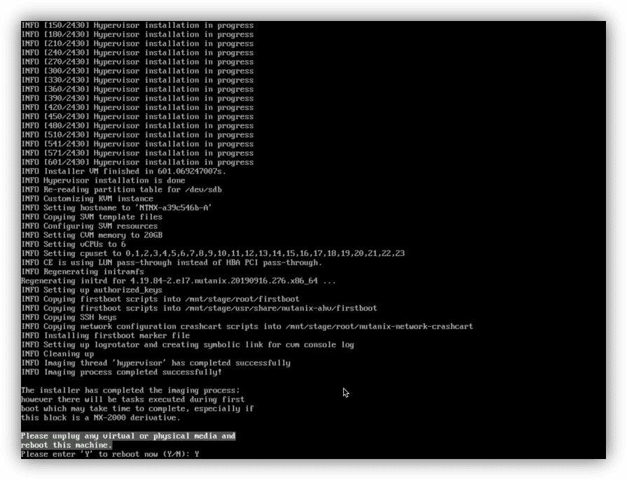 最后,安装成功的话,拔出U盘,重启服务器。如果是多节点安装,每个节点都需重复这个过程,注意提前规划好Host Ip和CVM Ip的网段。