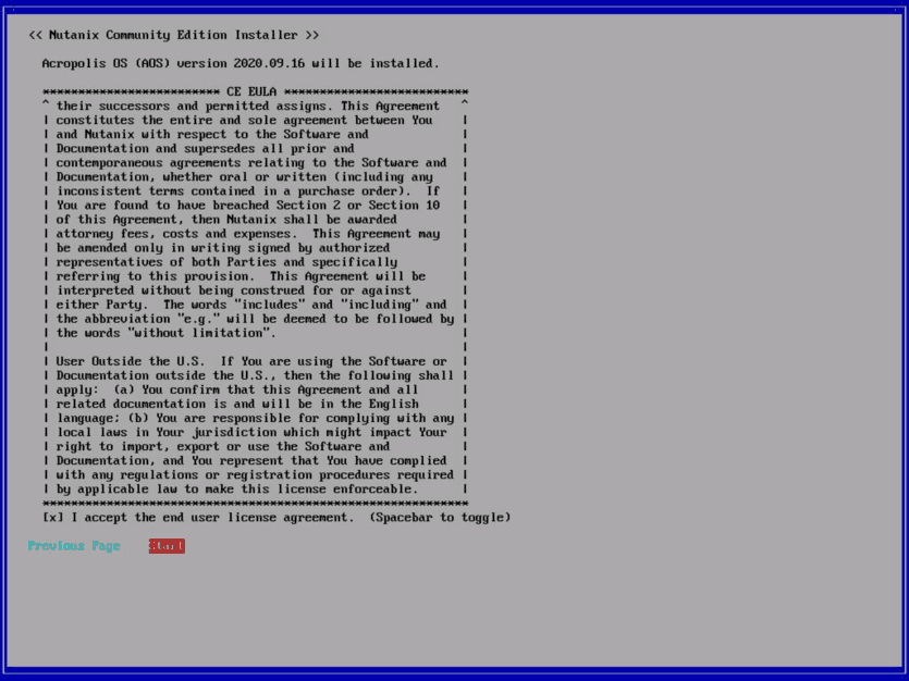 阅读完用户许可证全文后,选中接受,并且点击开始。Nutanix CE是一个裁剪版本有限制的软件,本文建议用于开发测试环境。