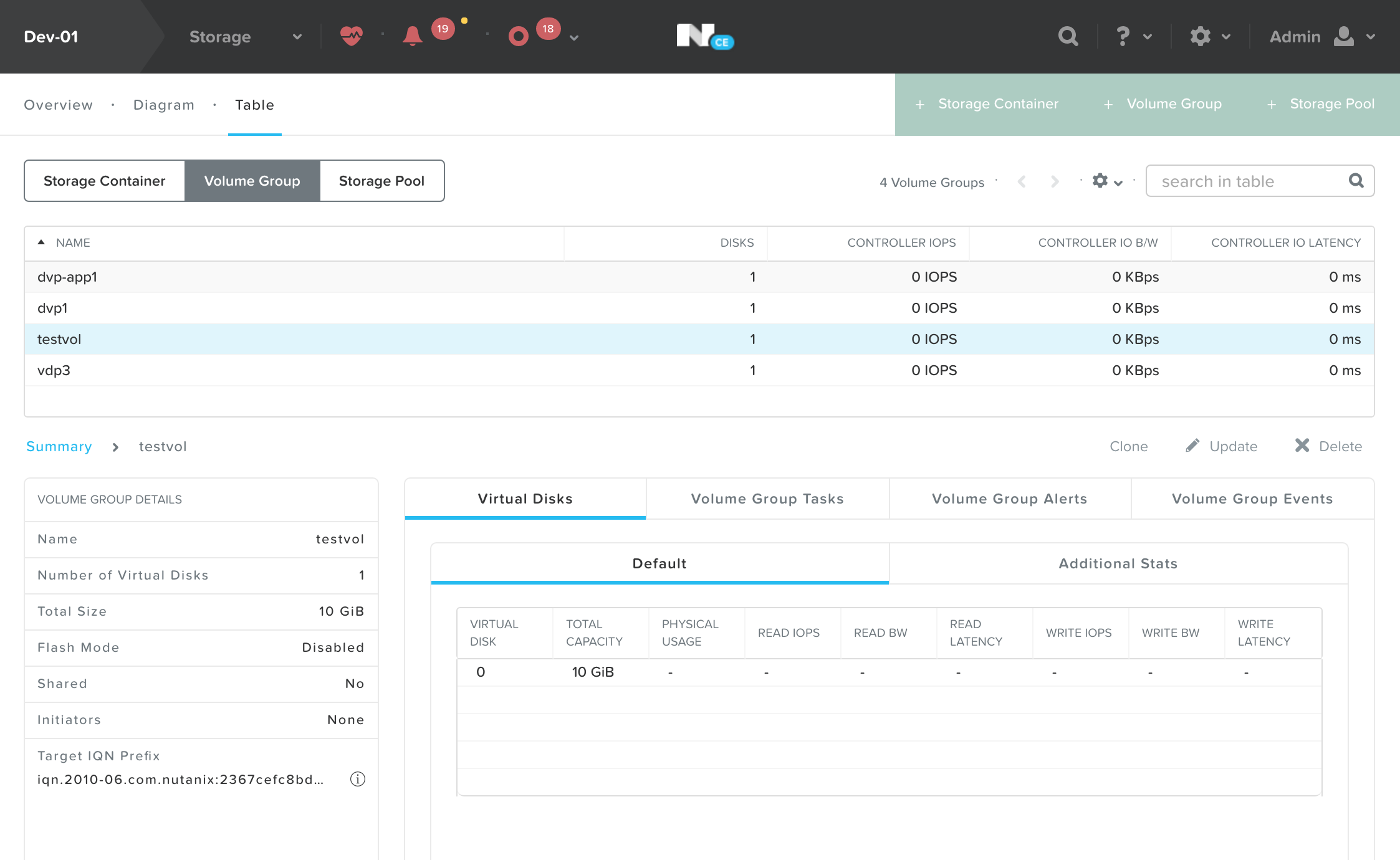 回到Nutanix的Prisum界面(主要的群集管理图形化界面)中查看Storage –> table –> Volume Group,应该能看到这个命令所创建的名为testvol的数据卷。如下图所示: