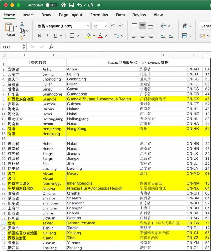 现在来浏览 Elastic Map 地图服务所引用的中国各省的中英文名称和代码,查看 https://maps.elastic.co/#file/china_provinces ;