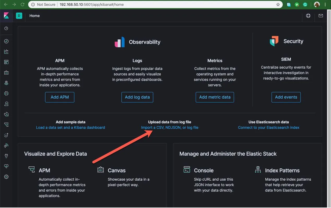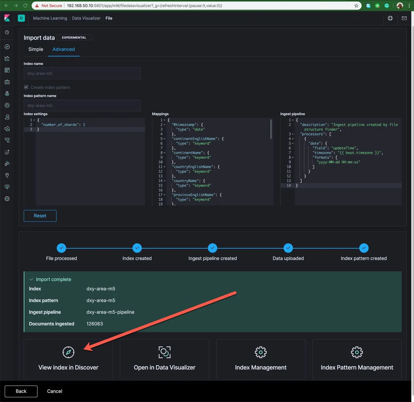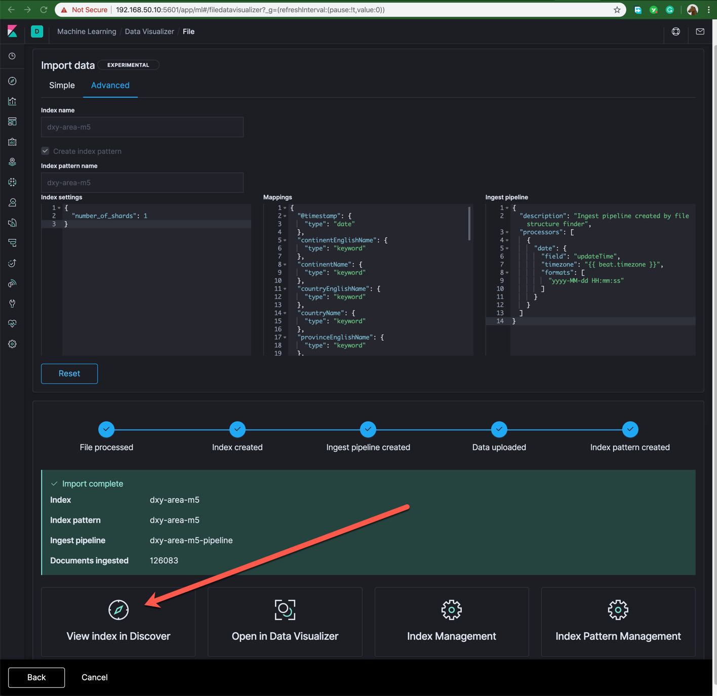 本文选择了最简单直接的方式,使用 Kibana 自带的数据导入功能,手工导入丁香园的 csv 时序数据文件 csv/DXYArea.csv。 如下图所示。