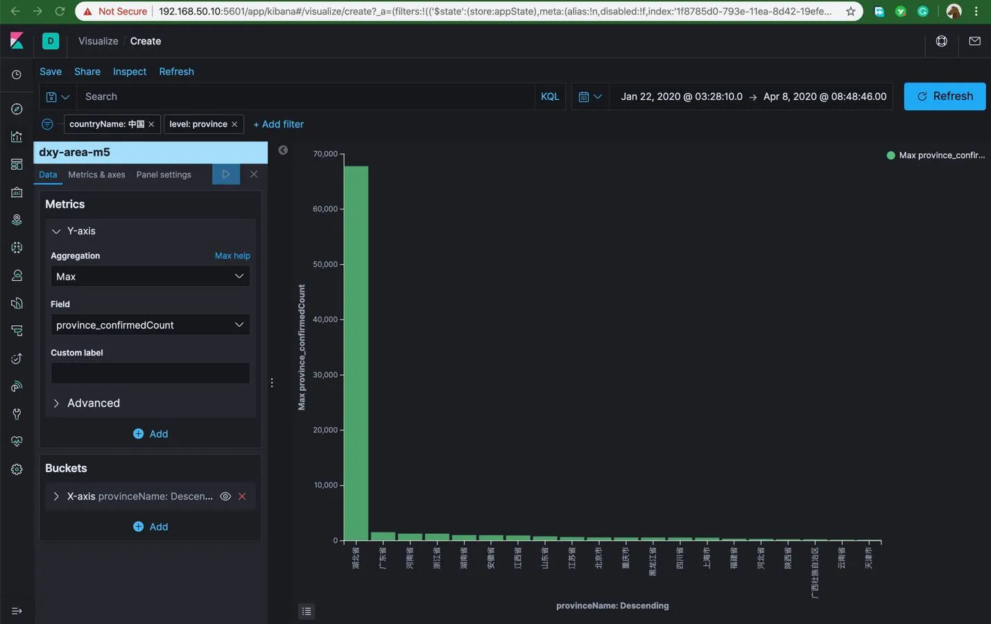 进入这个 field 的默认可视化配置模式,选择 Y 轴的指标为 province_confirmedCount 的最大值,然后在上方增加 is_china:true 和 level:province 过滤条件后,就可以得到下面的结果。