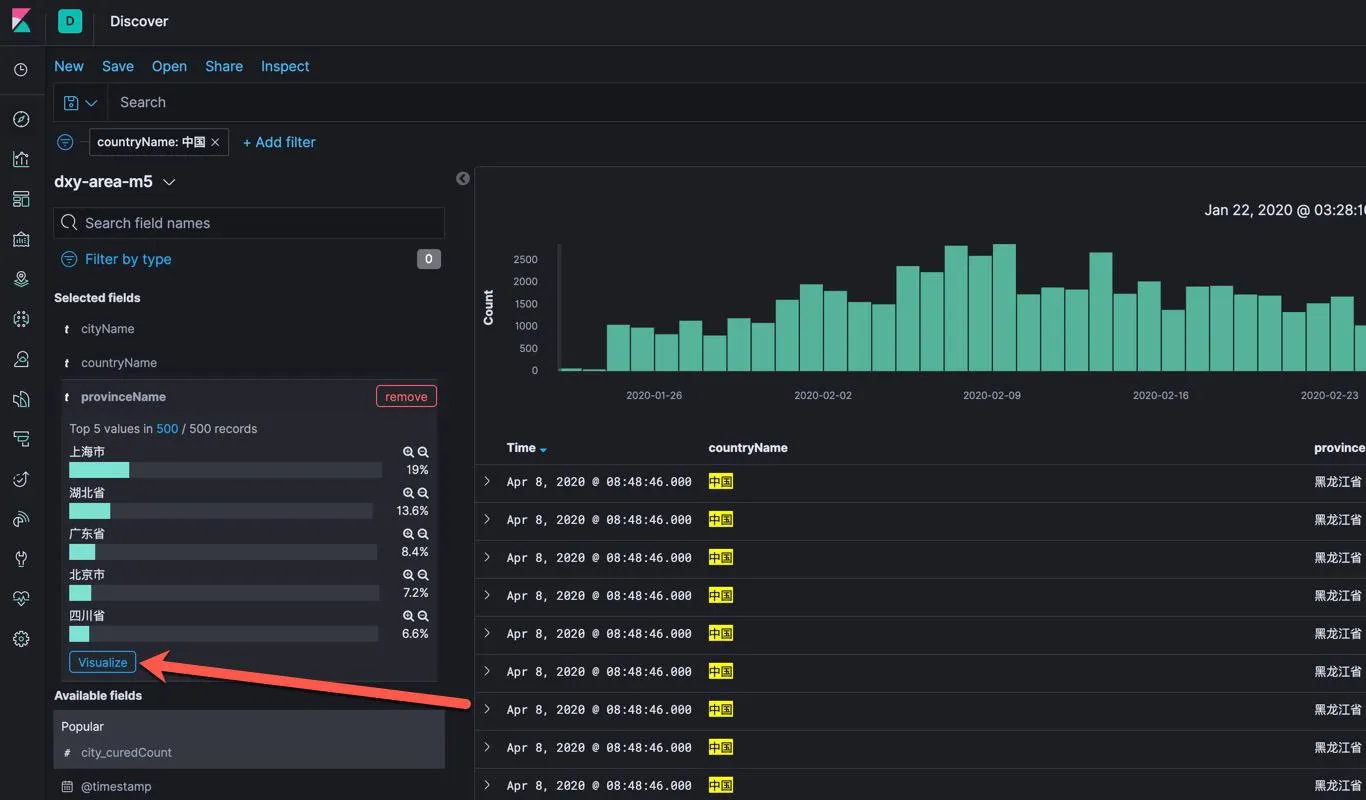 在 Discovery 的查询界面里,点击左侧 fields 清单中的 provinceName,或者其它想进行可视化分析的字段,点击后即可查看其中一部分的数值分布情况,点击下面的 Visualize 按钮。就可以进入可视化编辑模式。