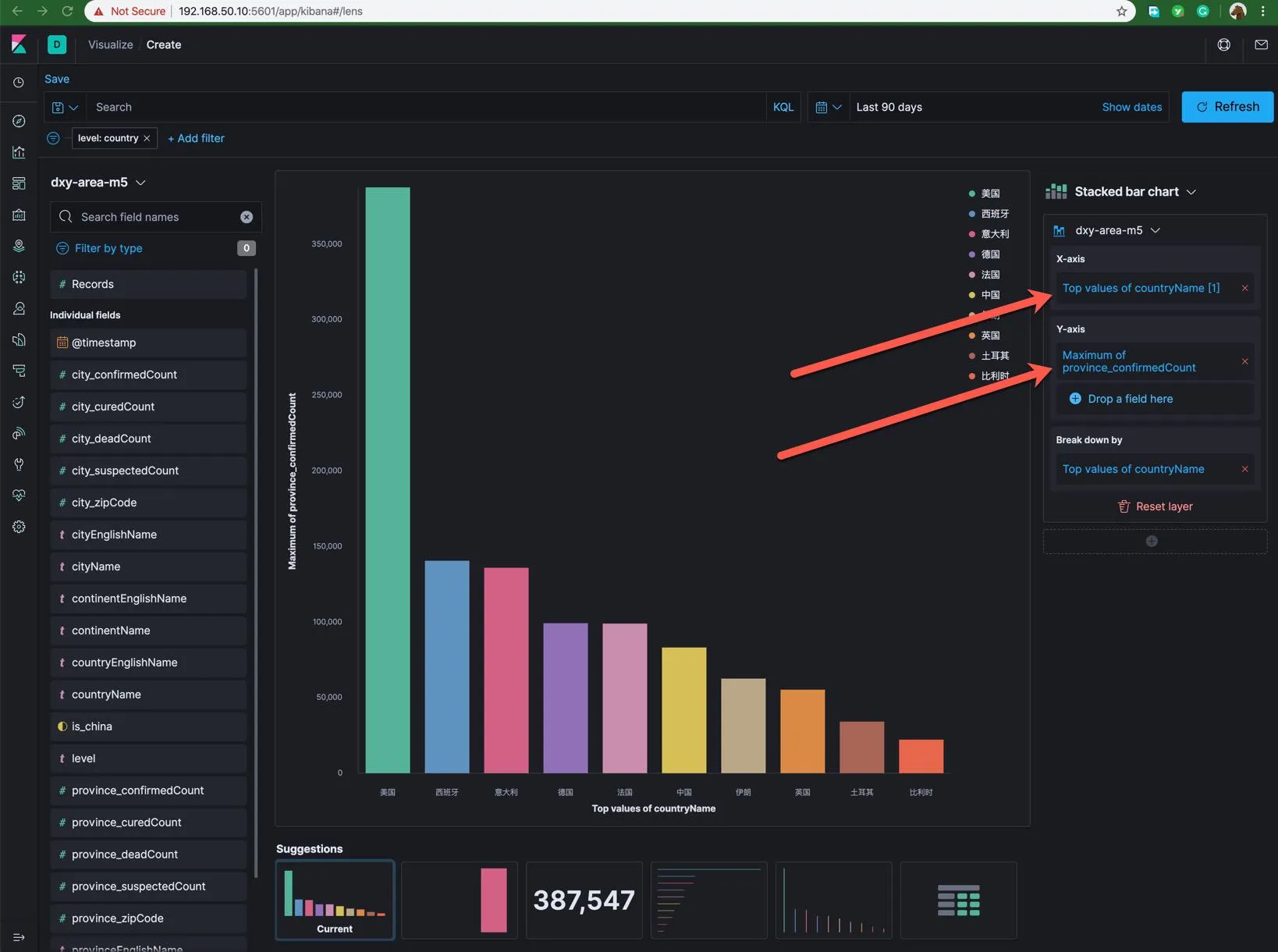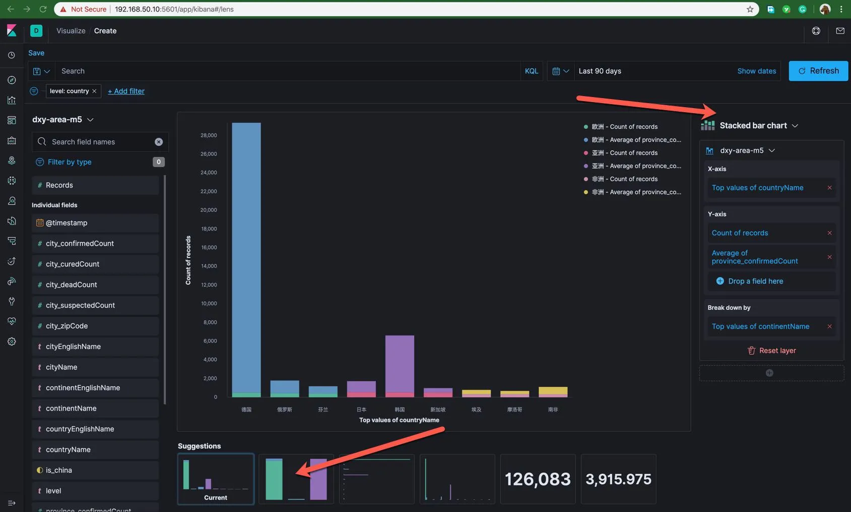 点击 New Visualization,选择左上角的 Lens 图标。在 CHANGE INDEX PATTERN 中选择目标的索引如:dxy-area-m5。 拖拽几个字段进入中间的显示区:continentName countryName province_confirmedCount 这些字段,也可以尝试将这些字段拖入右侧的 X 轴或者 Y 轴。