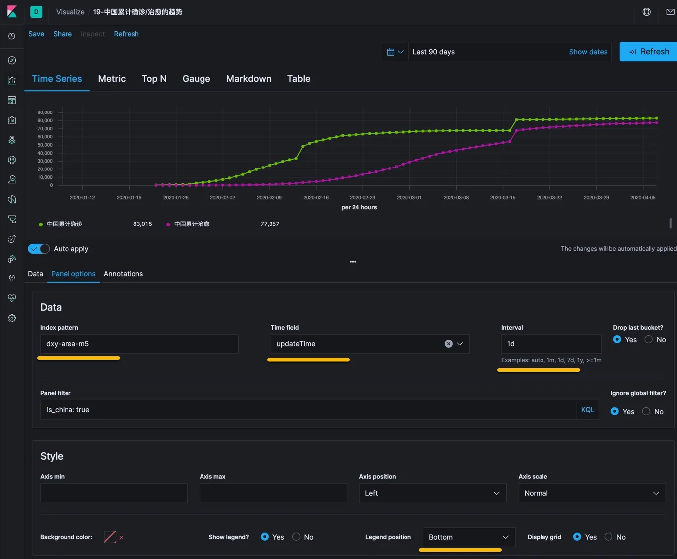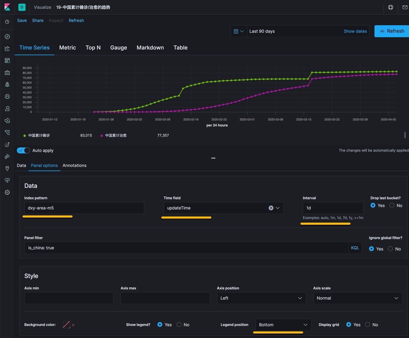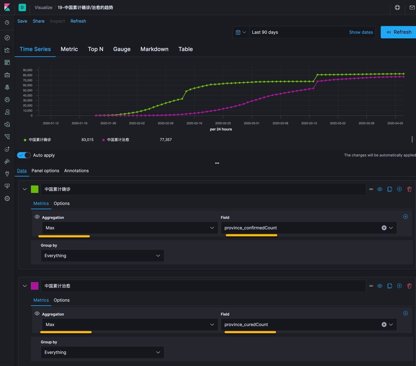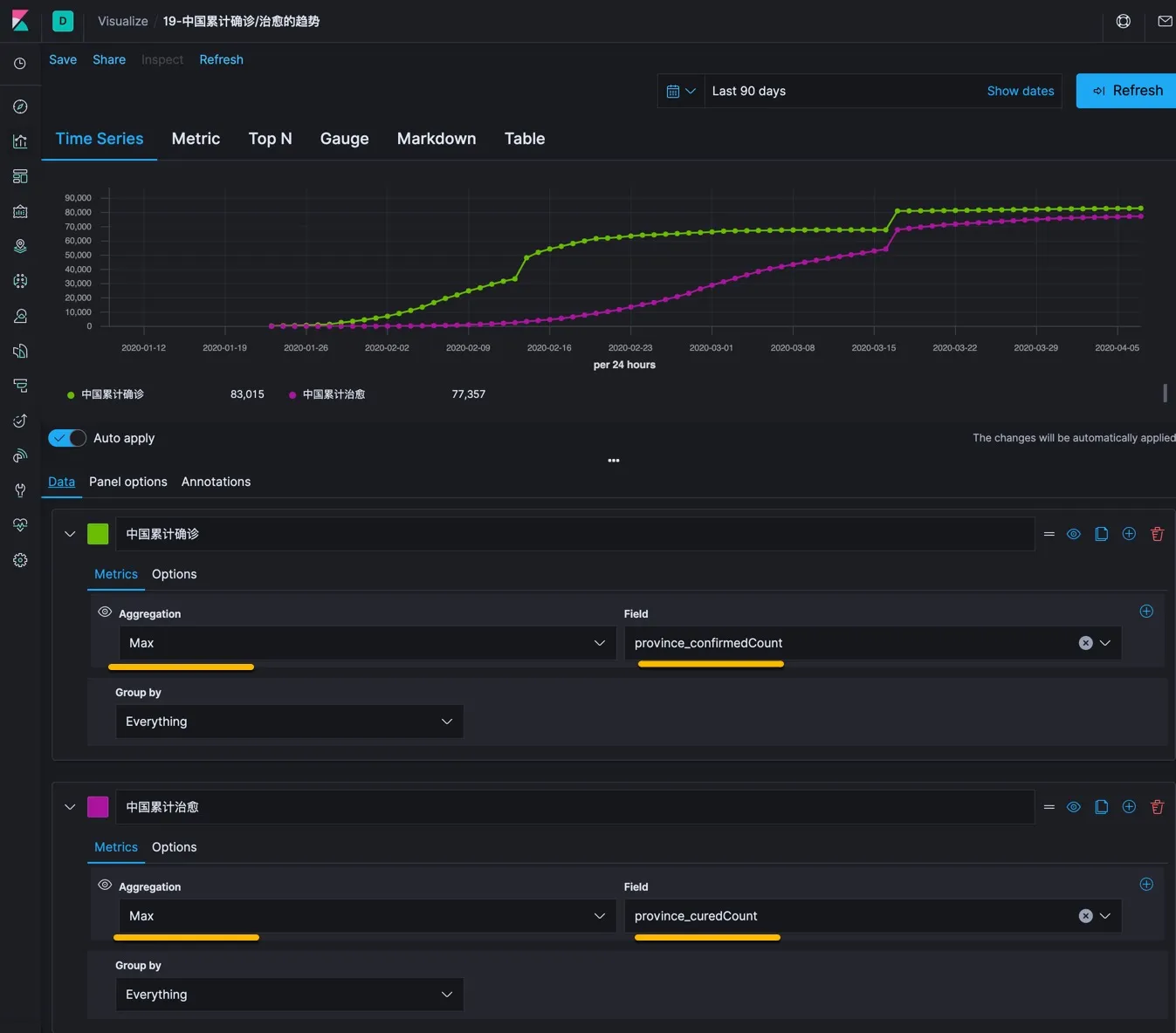 然后在 Data 中选择需要显示的数据指标,如上图中选择了全国累计确诊和累计治愈,两个指标。将他们放在一起更能回答这样一个问题:是否治愈的速度是足够的,如果治愈速度跟得上的话,说明医疗资源是足够用的,如果这两条线之间的落差比较大就危险了。