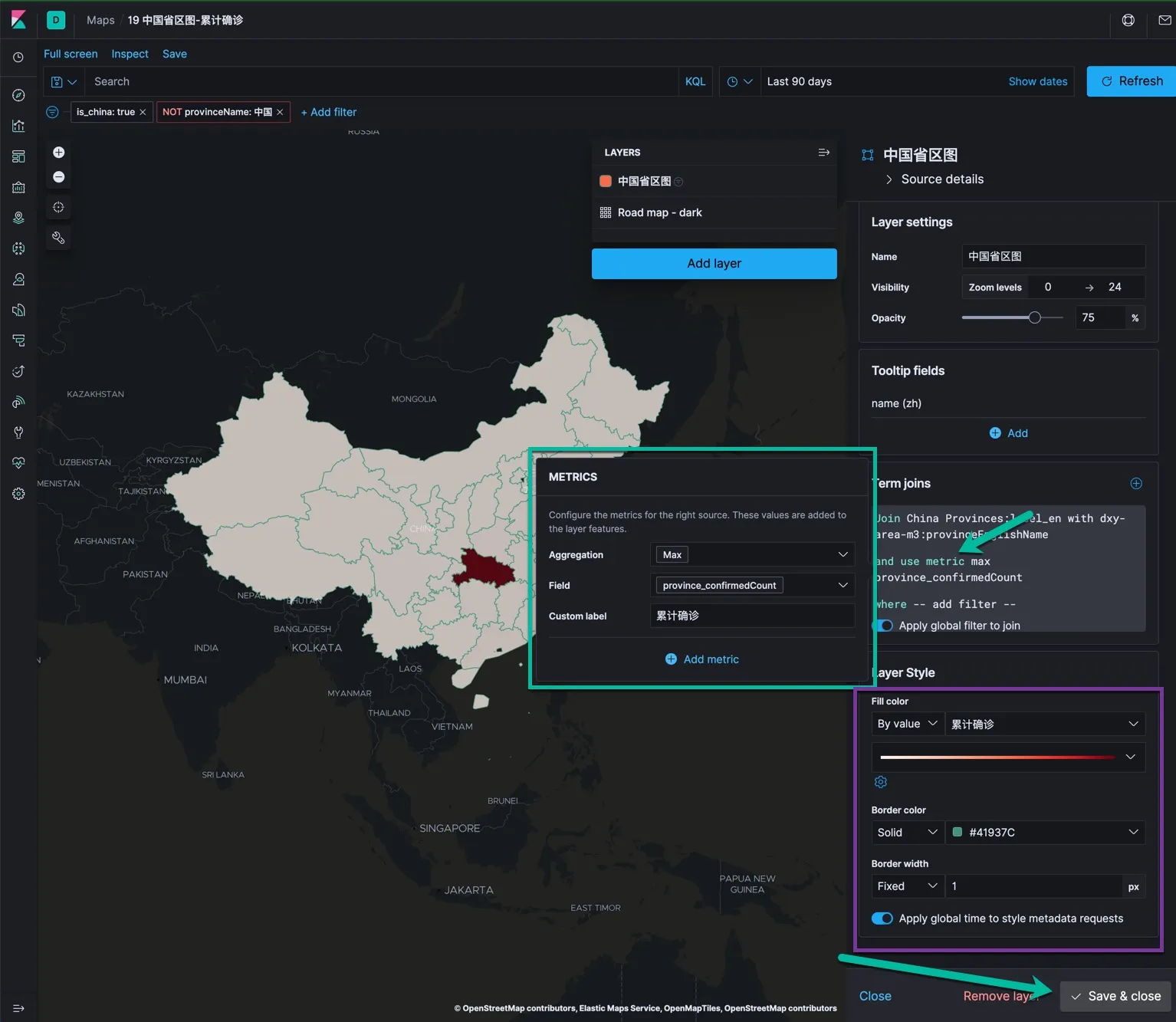 这里的技术点在于:Elastic 地图中的基础数据(地理名称代码)必须和目标索引中的相关字段能够匹配上(join)上,然后才能将索引中的实际做聚合运算的字段根据地理名称进行处理,例如根据数值的大小,将各个省填充成不同的颜色,用 tooltips 显示这个省的数据信息。
